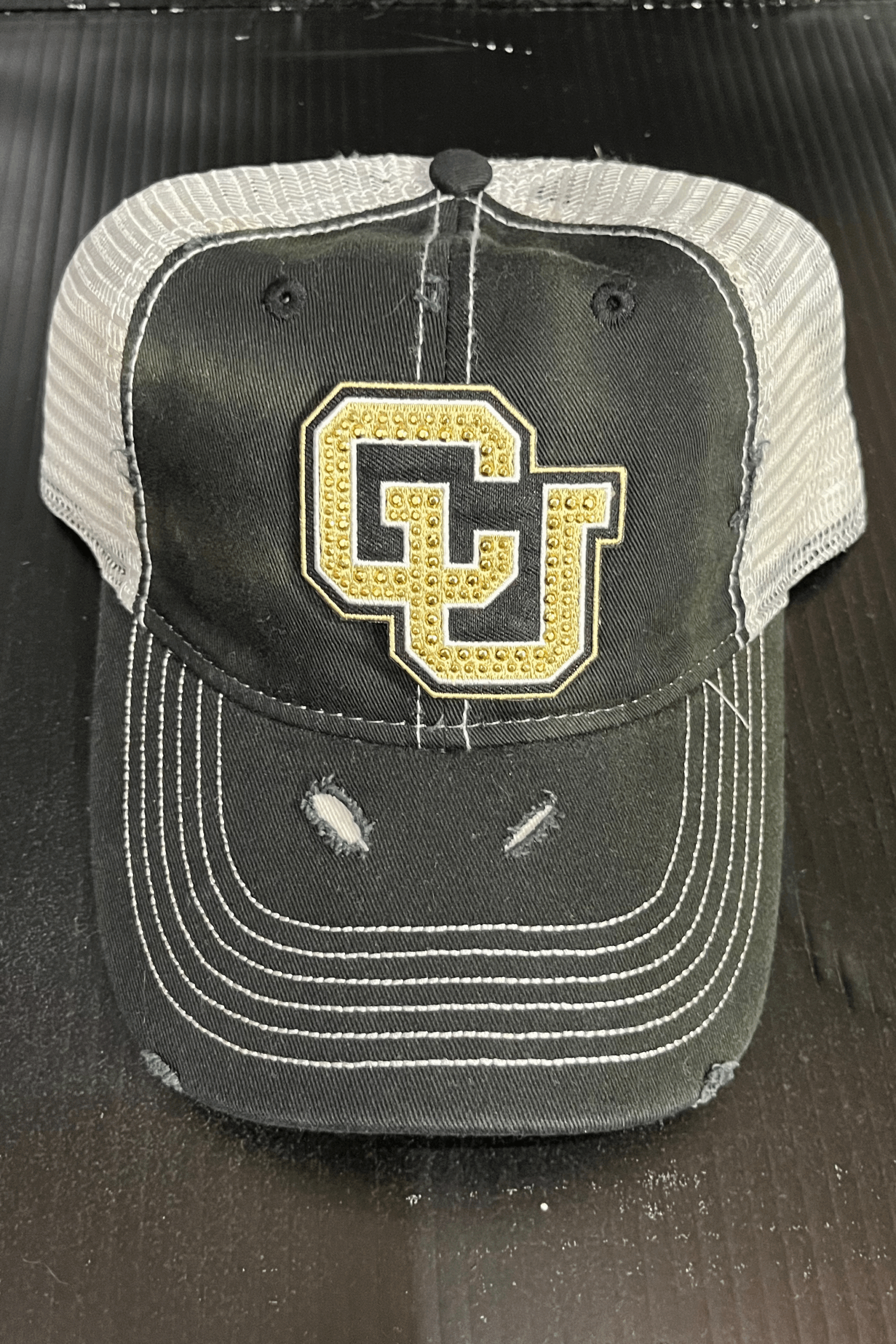Deconstructed vintage unisex trucker hat with rips and bling CU logo