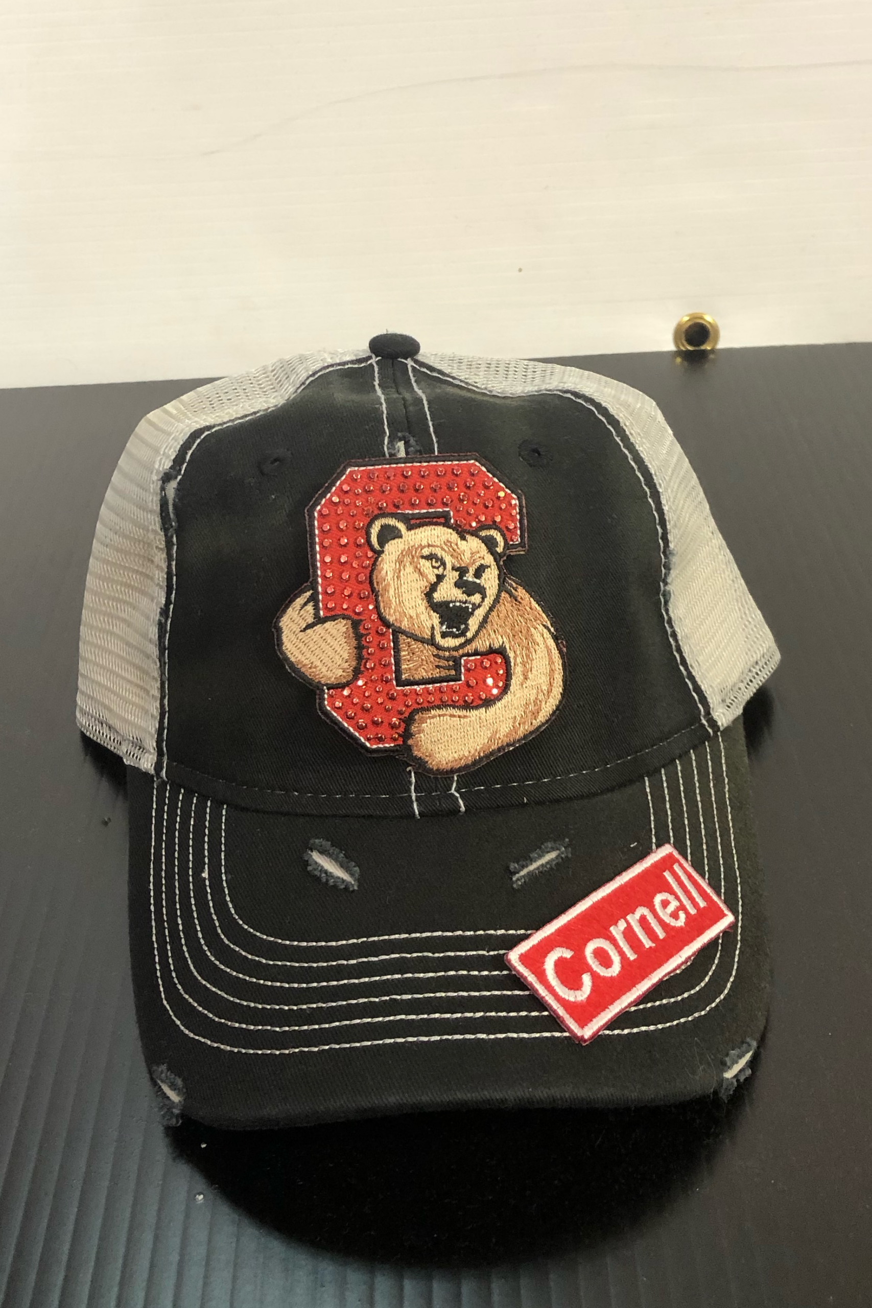 Deconstructed vintage trucker hat with rips and Cornell logos