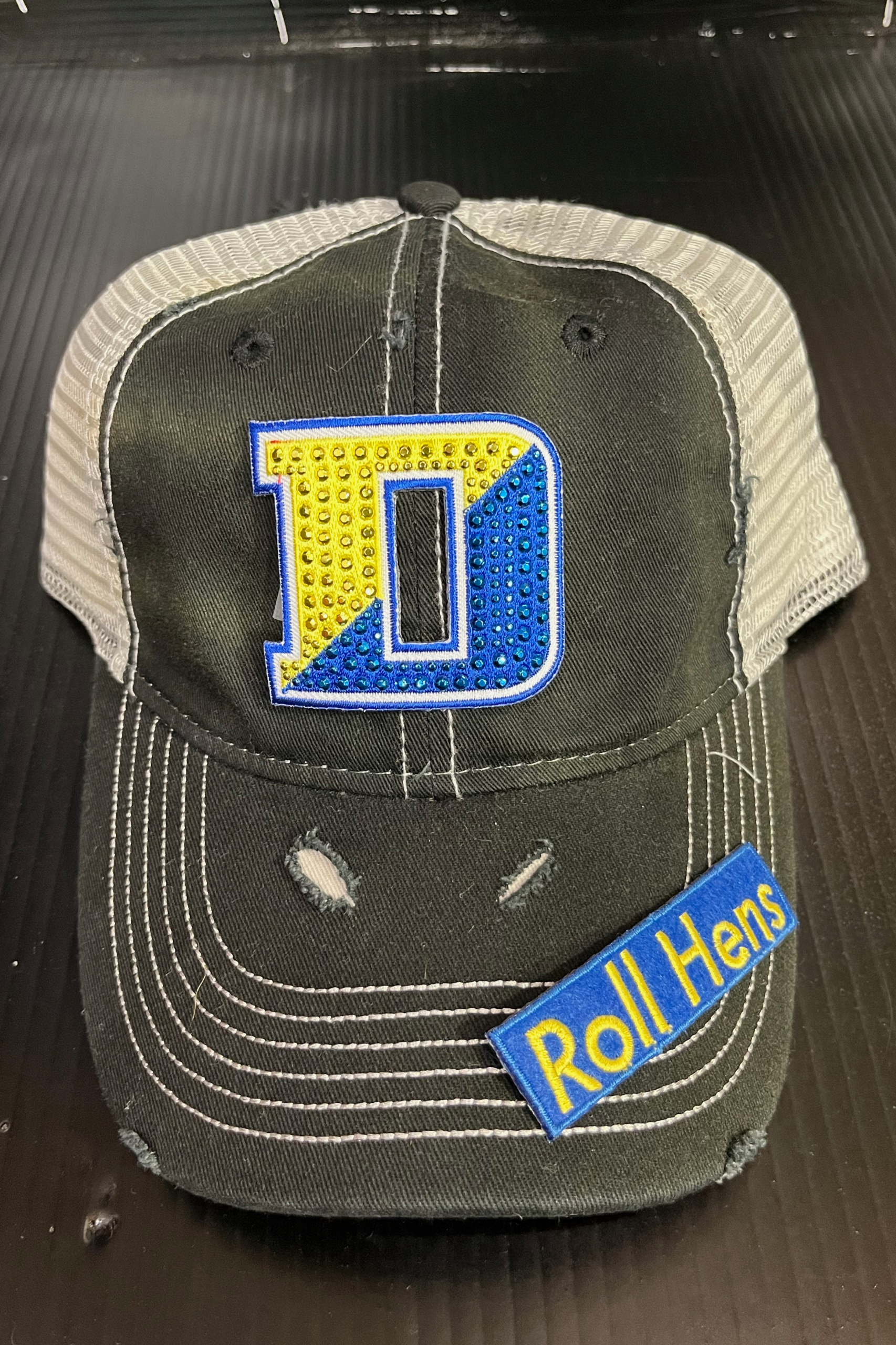 Deconstructed vintage unisex trucker hat with rips and bling UD logo and “Roll Hen” on brim