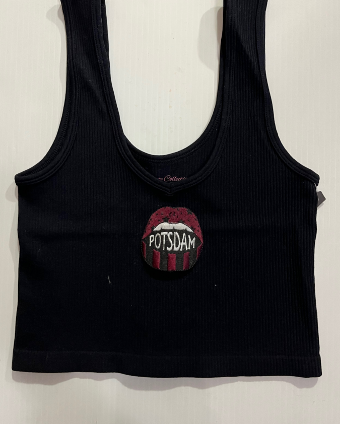 Deconstructed vintage unisex trucker hat with rips and college logo