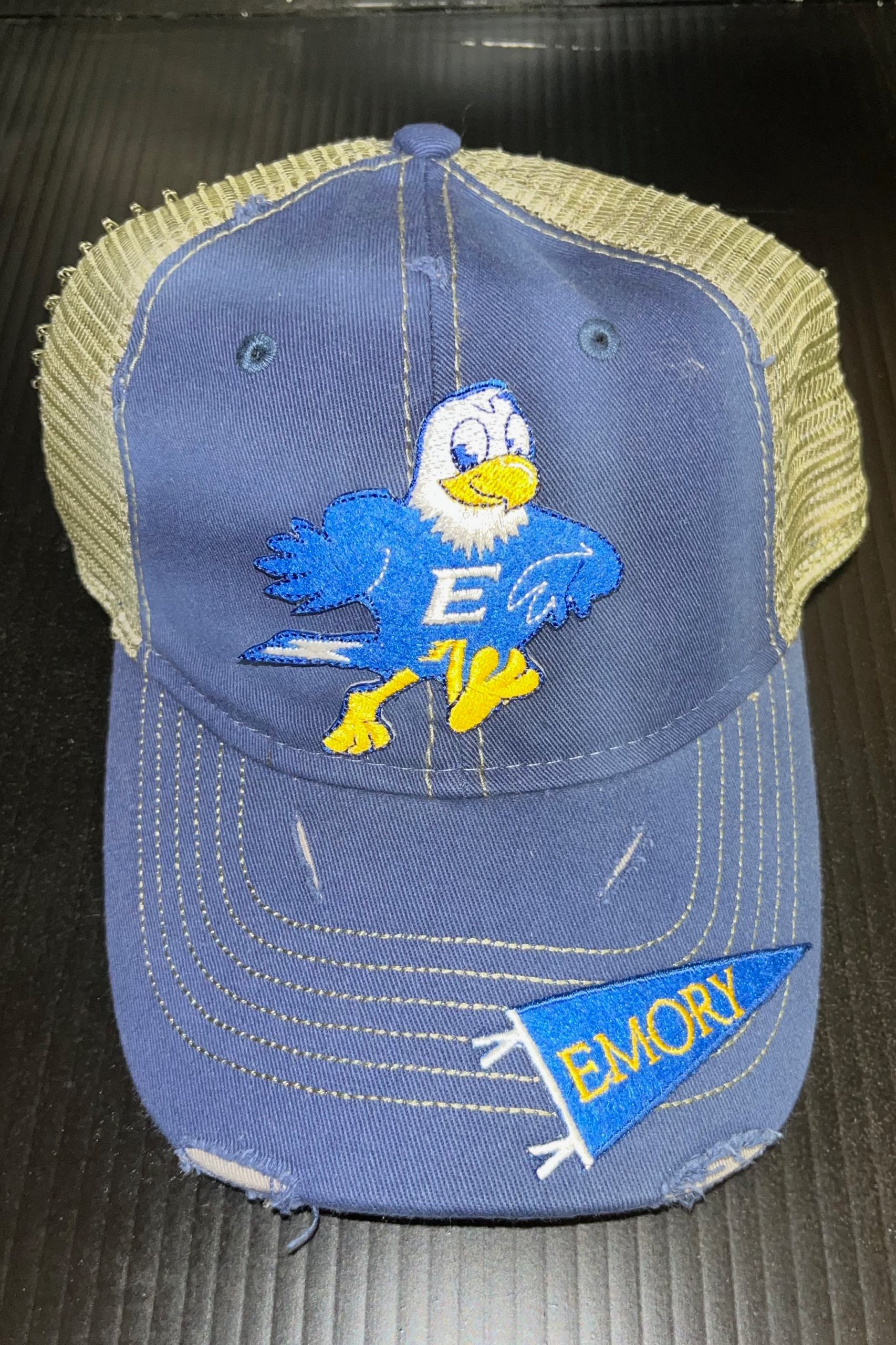Deconstructed vintage unisex trucker hat with rips and Emory logos