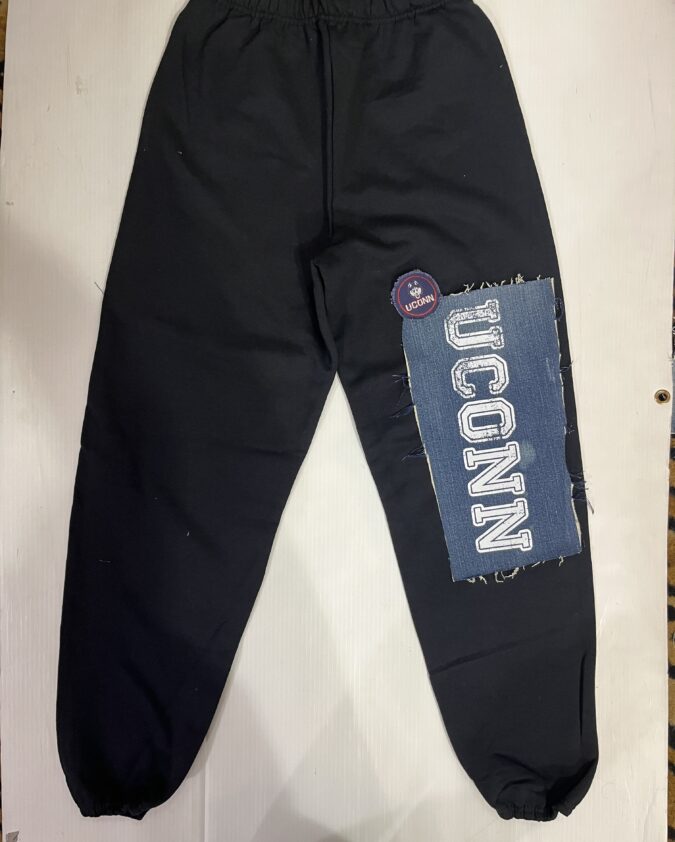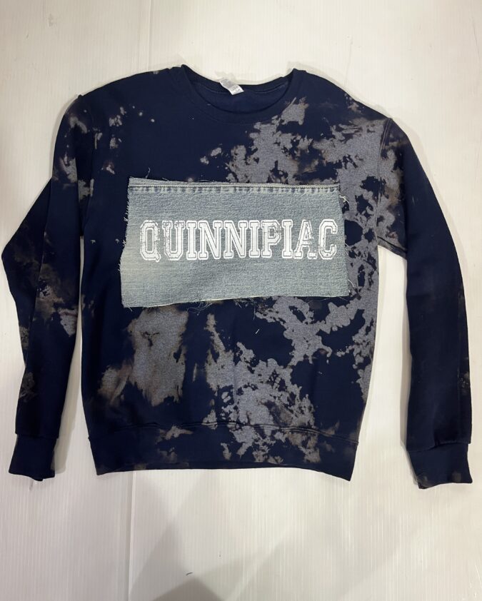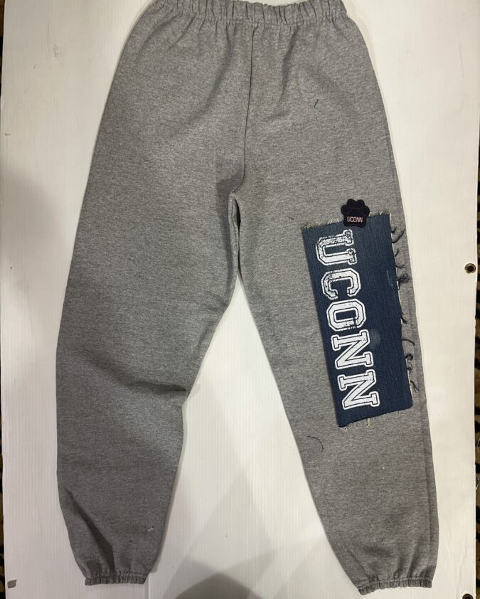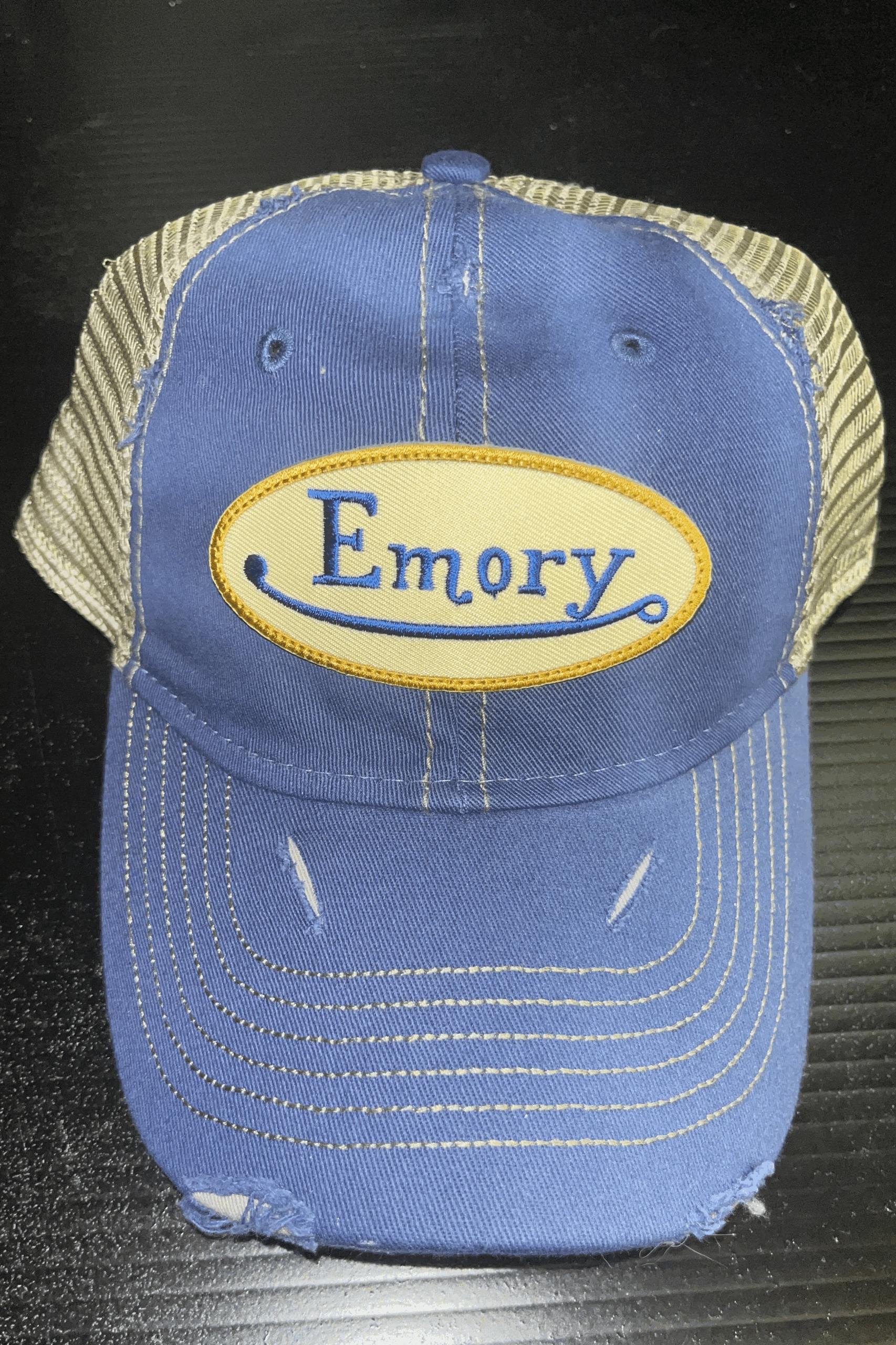 Deconstructed vintage unisex trucker hat with rips and college logo