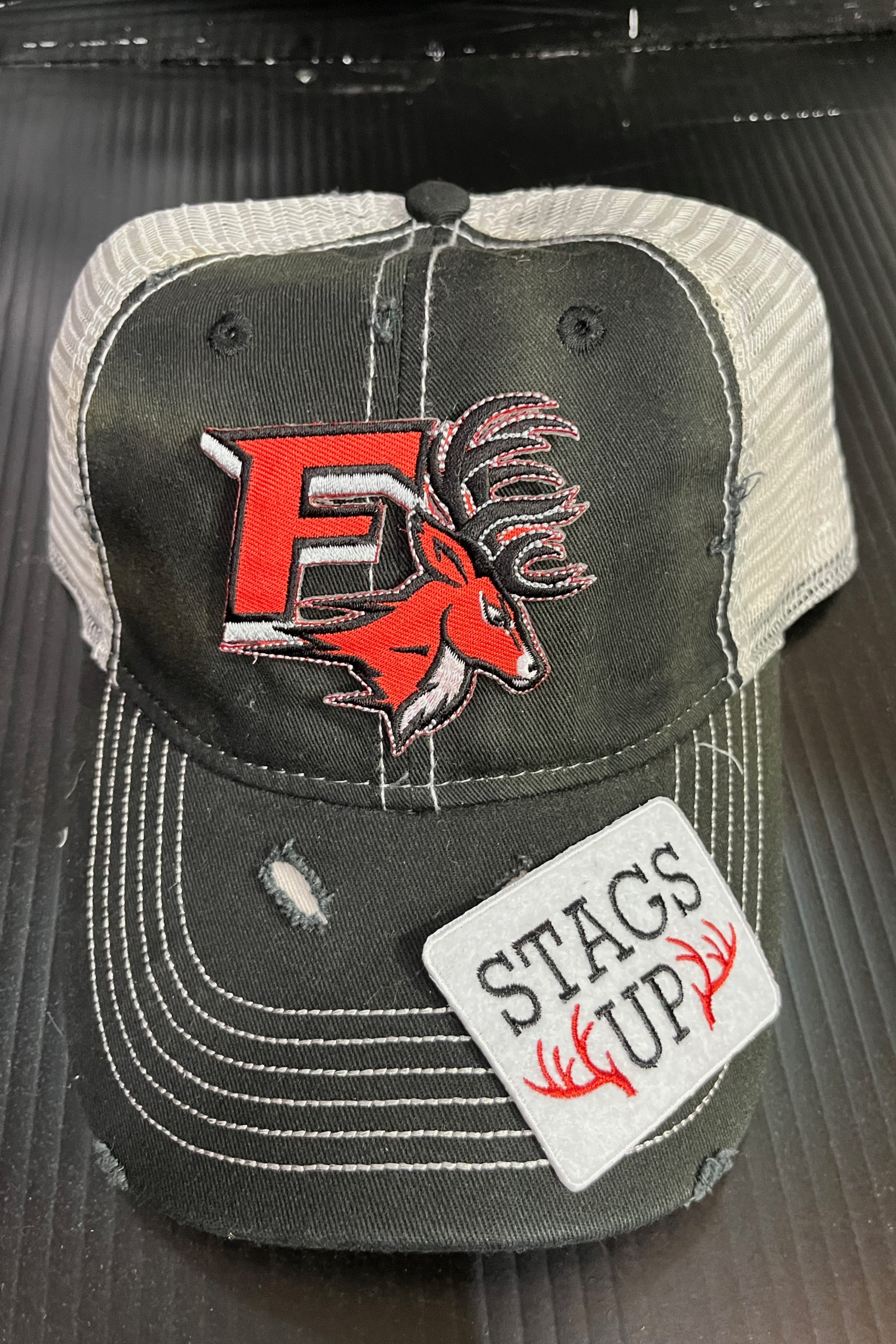 Deconstructed vintage unisex trucker hat with rips and Fairfield logo