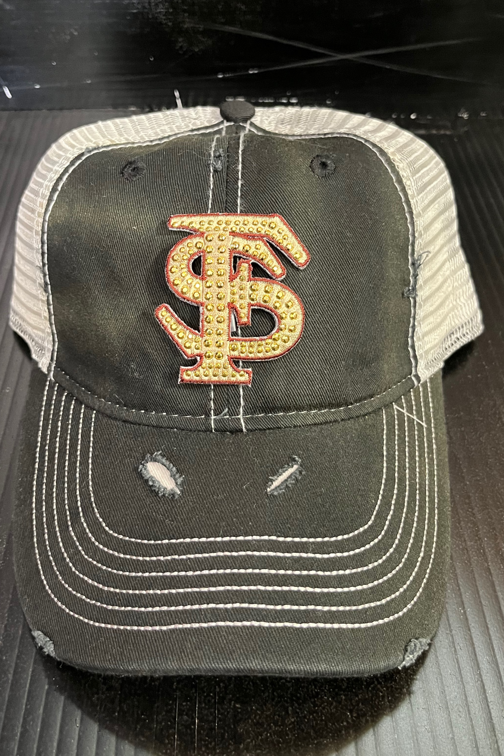 Deconstructed vintage unisex trucker hat with rips and bling FSU logo
