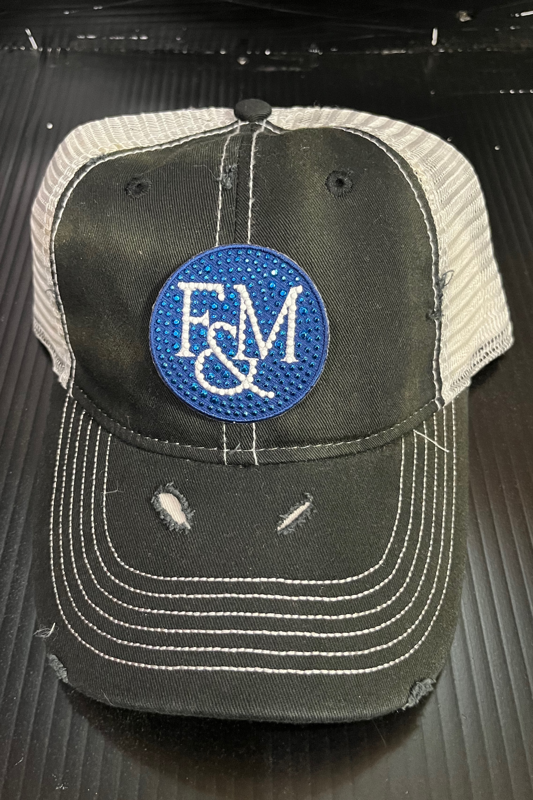 Deconstructed vintage unisex trucker hat with rips and F&M logo