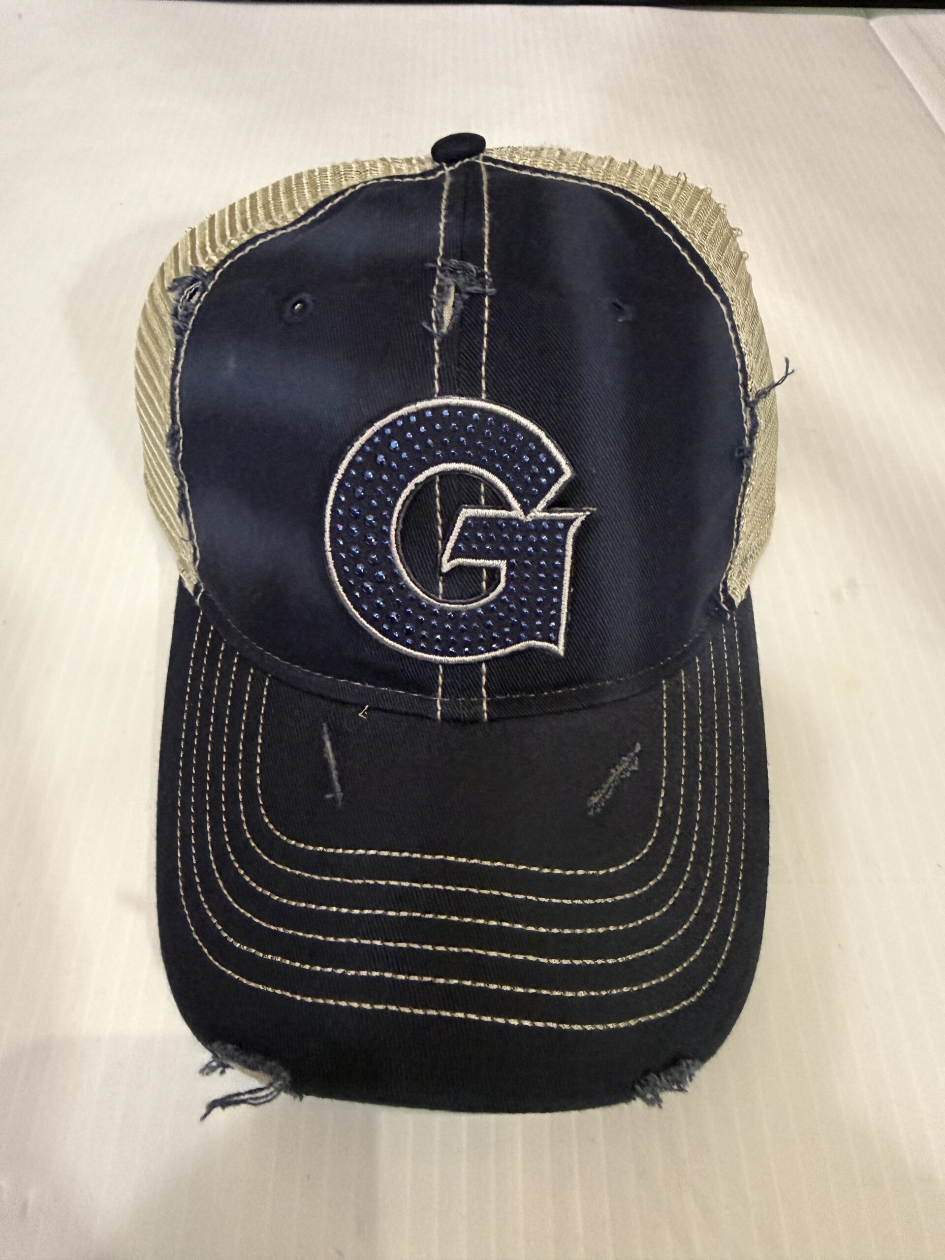Deconstructed vintage unisex trucker hat with rips and bling logo