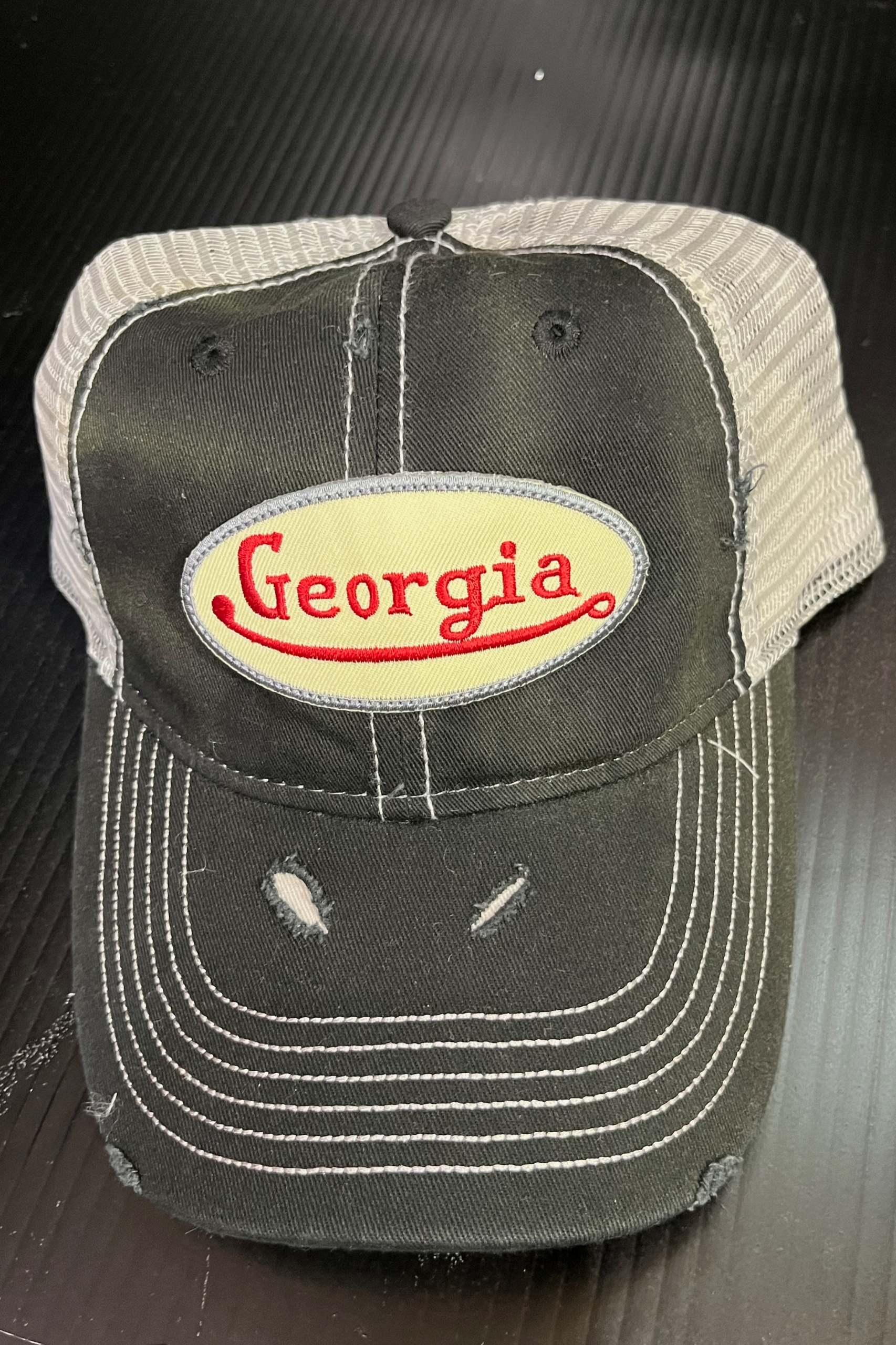 Deconstructed vintage unisex trucker hat with rips and Georgia logo