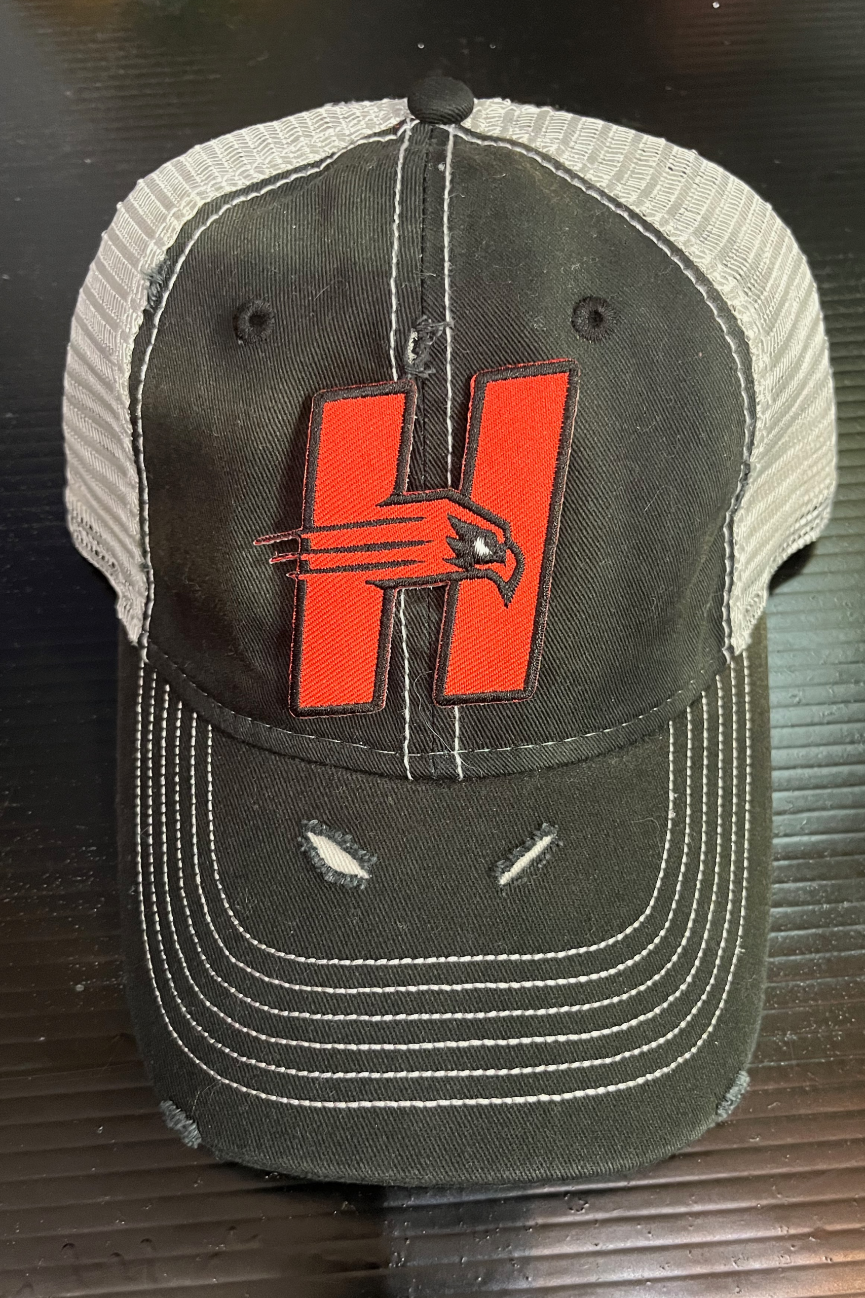 Deconstructed vintage unisex trucker hat with rips and Hartford logo