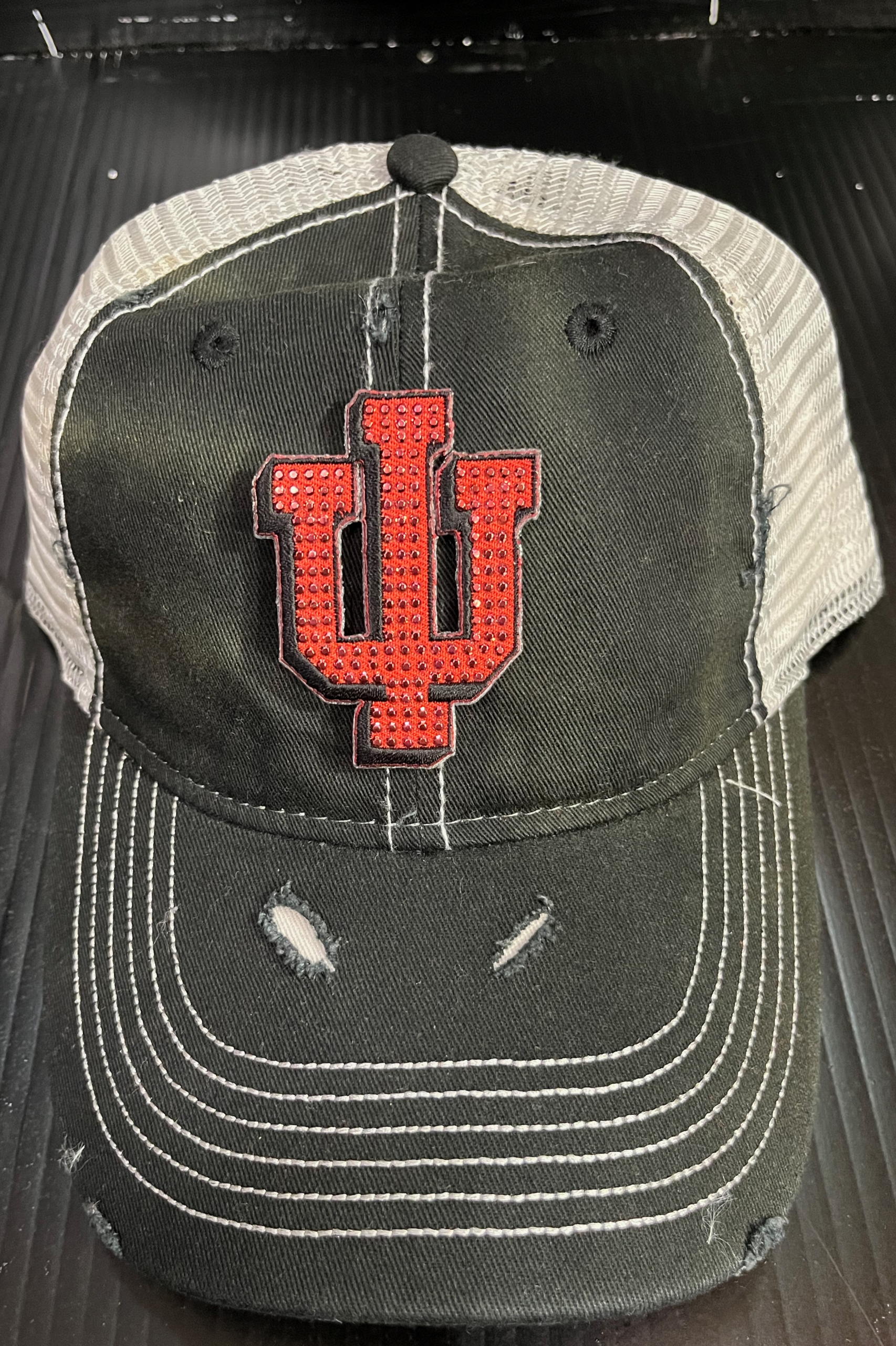 Deconstructed vintage unisex trucker hat with rips and bling IU logo