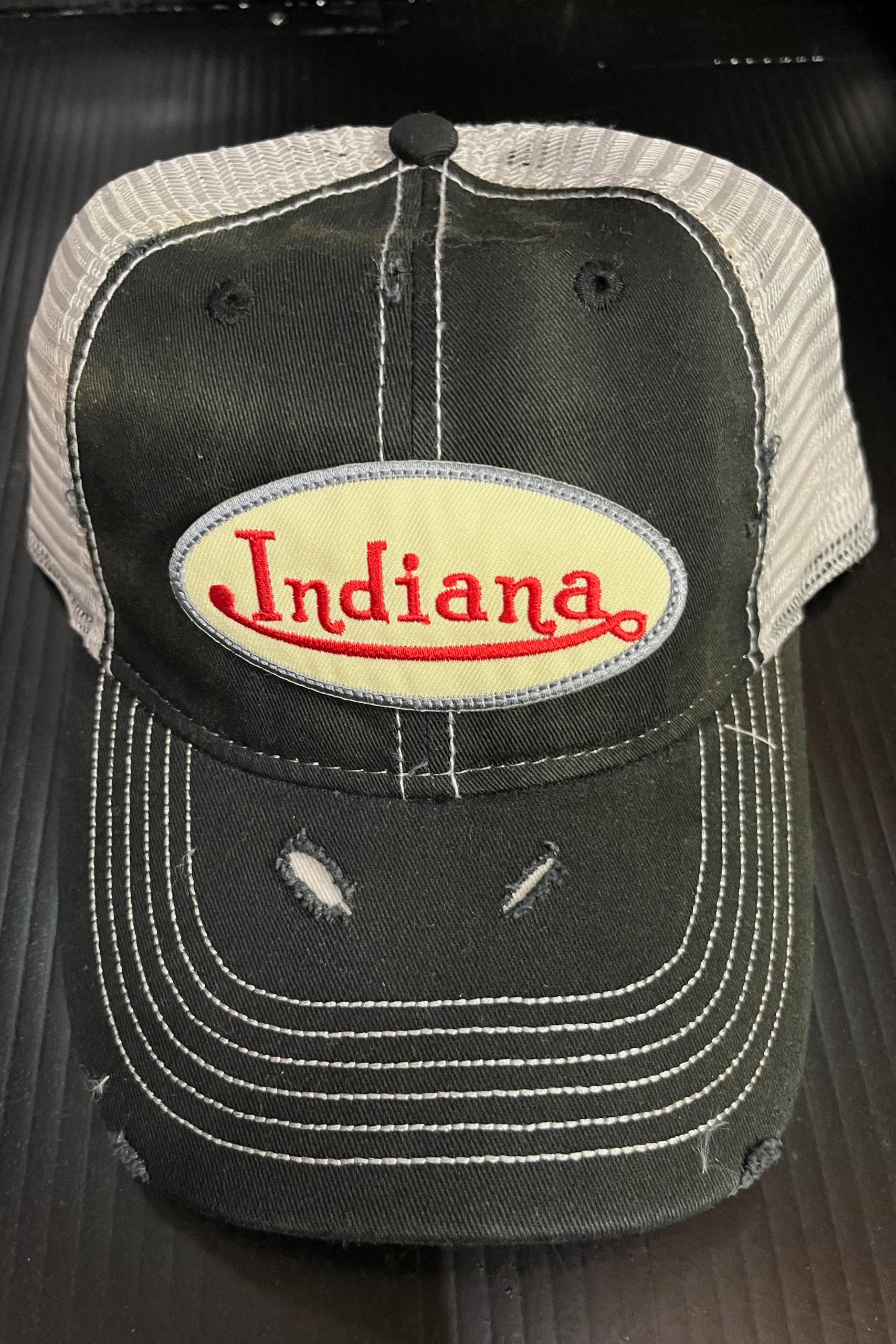 Deconstructed vintage unisex trucker hat with rips and IU logo