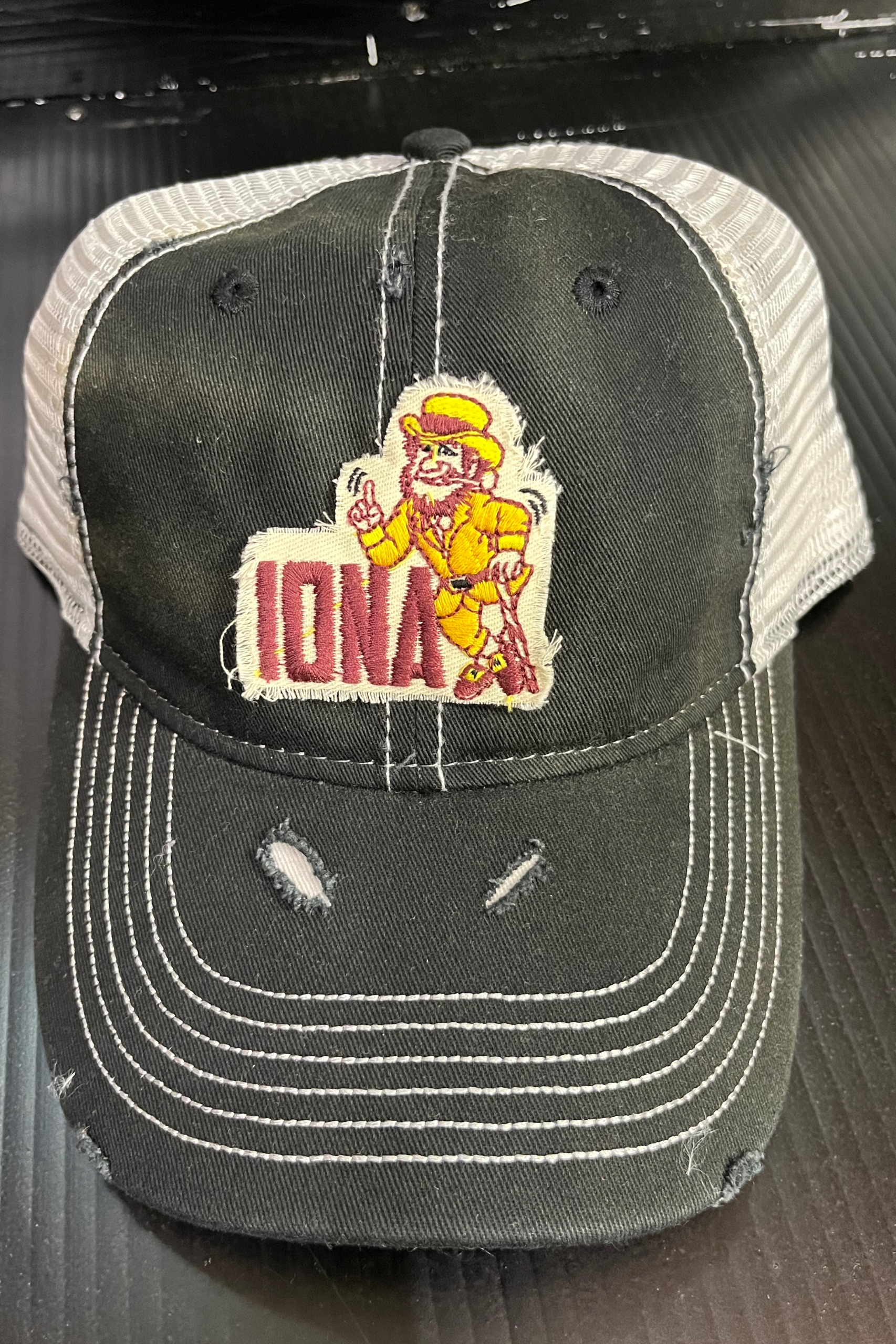 Deconstructed vintage unisex trucker hat with rips and Iona logo