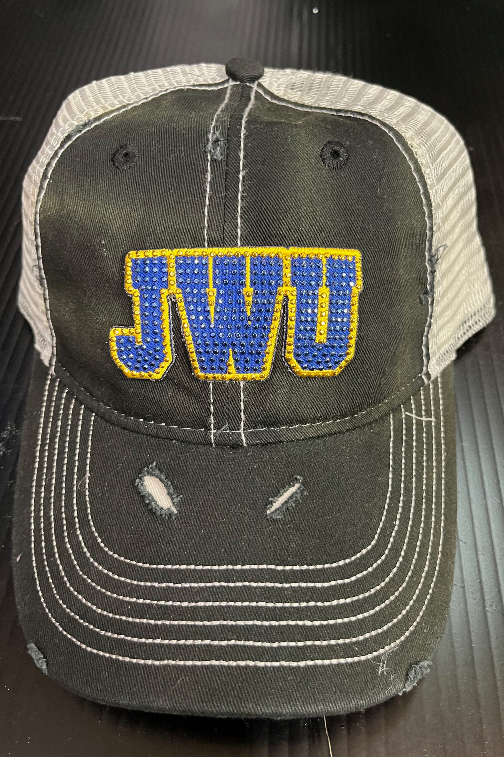 Deconstructed vintage unisex trucker hat with rips and bling JWU logo
