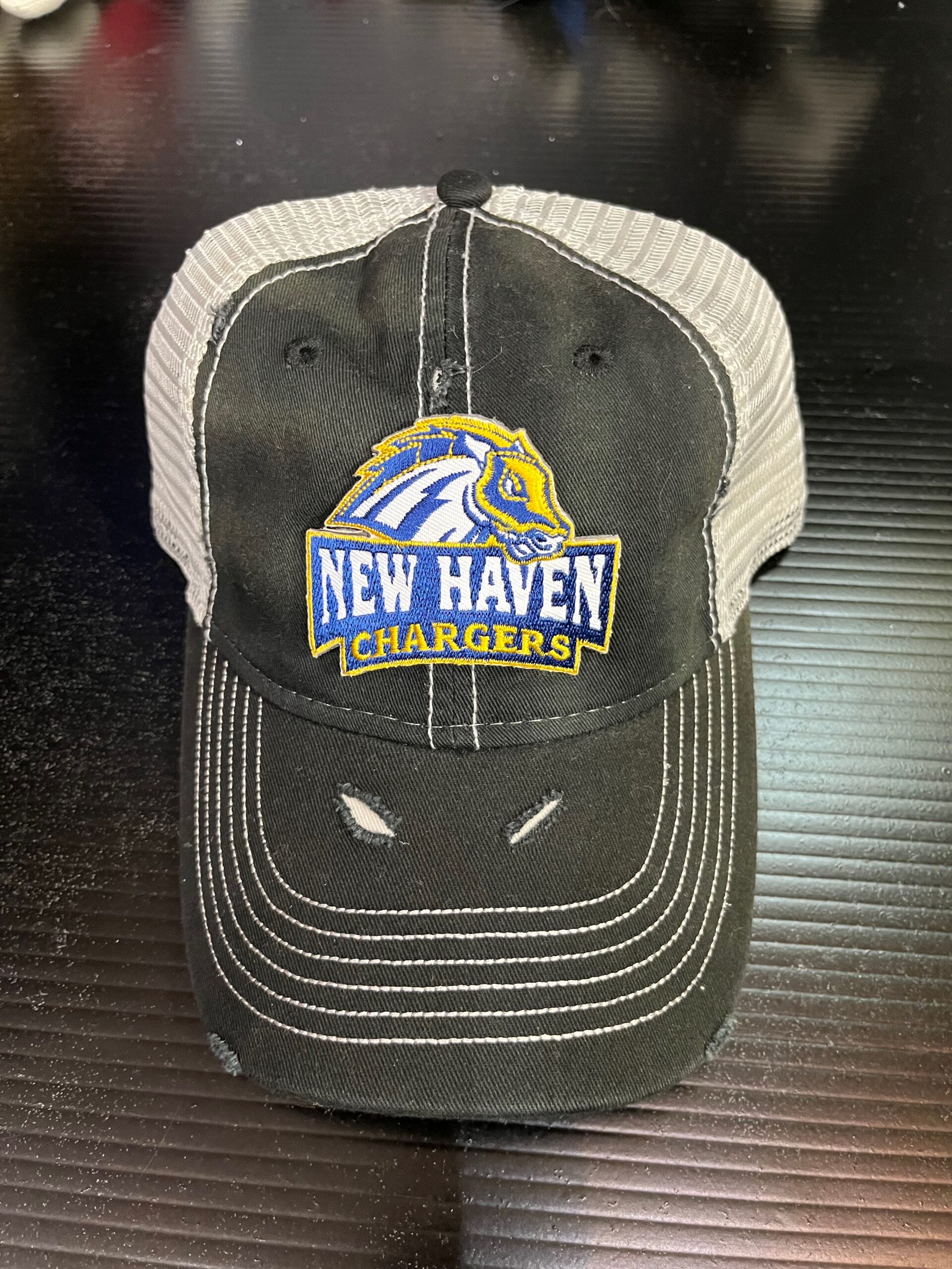 Deconstructed vintage unisex trucker hat with rips and New Haven logo