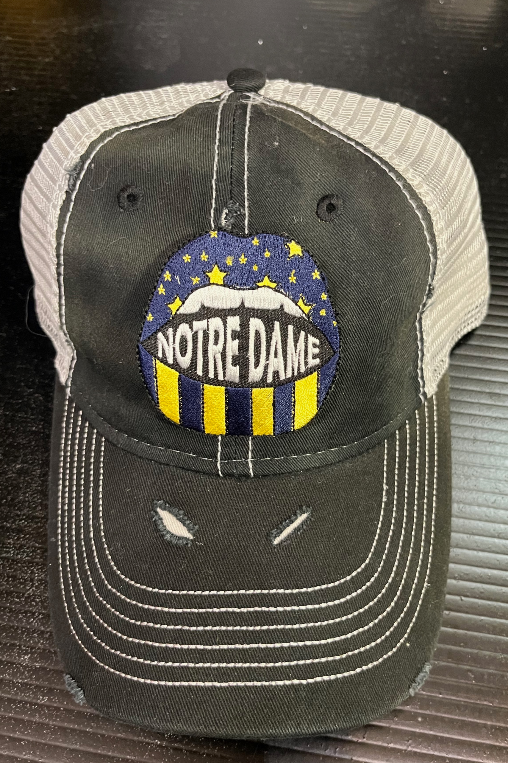Deconstructed vintage unisex trucker hat with rips and Notre Dame logo