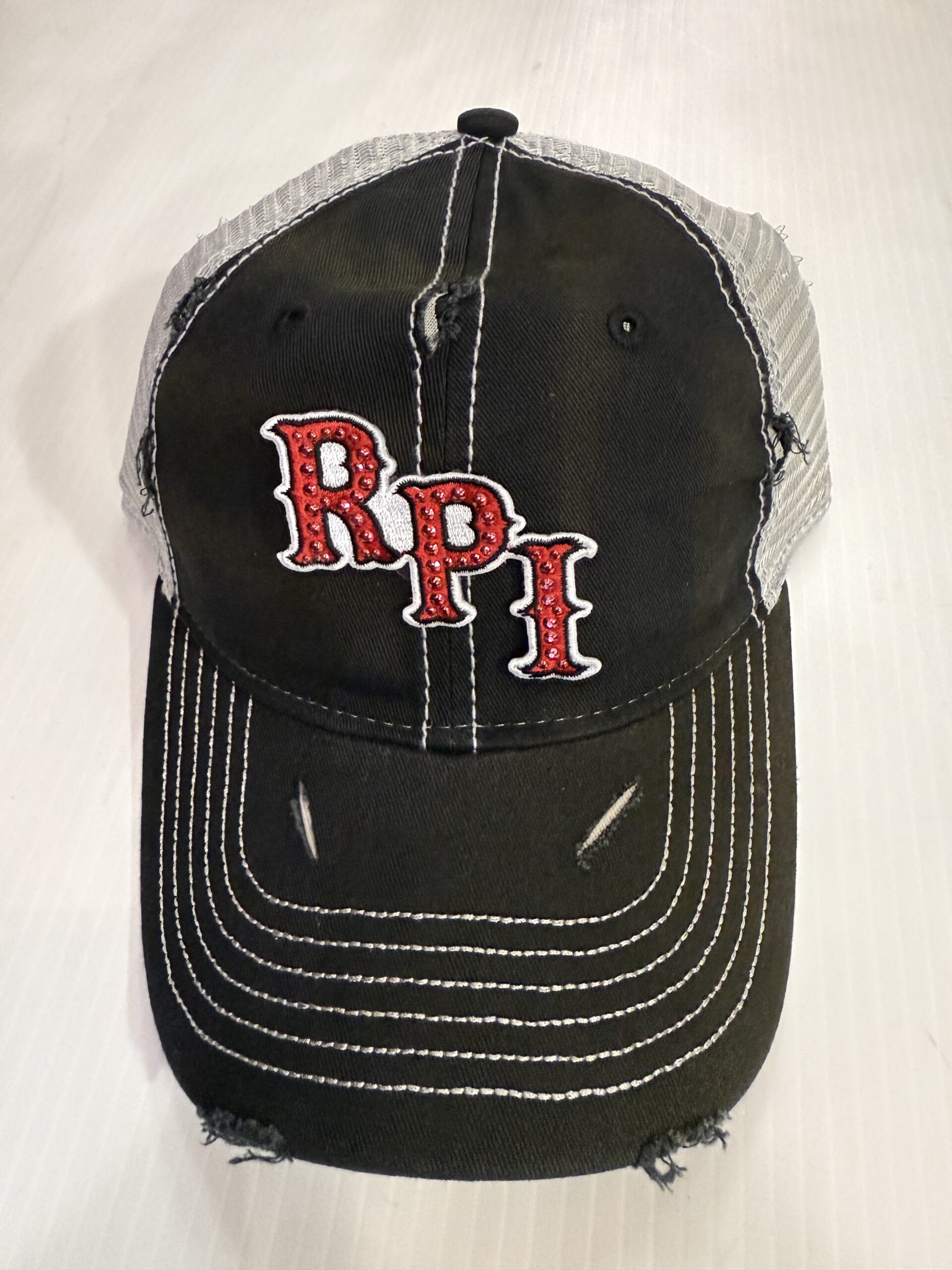Distressed trucker hat with bling college logo