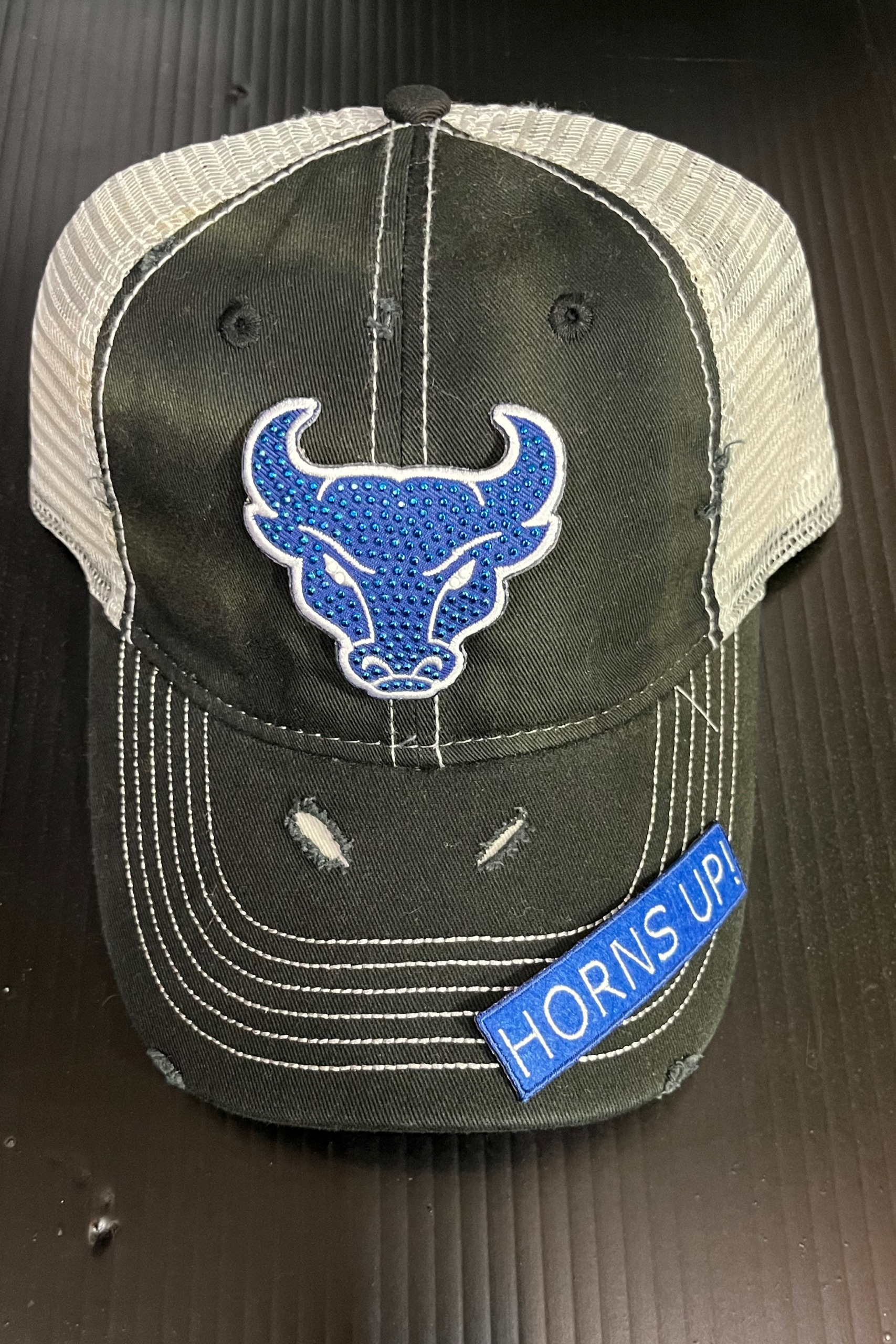 Deconstructed vintage unisex trucker hat with rips and UB bling logo + “Horns Up” on brim