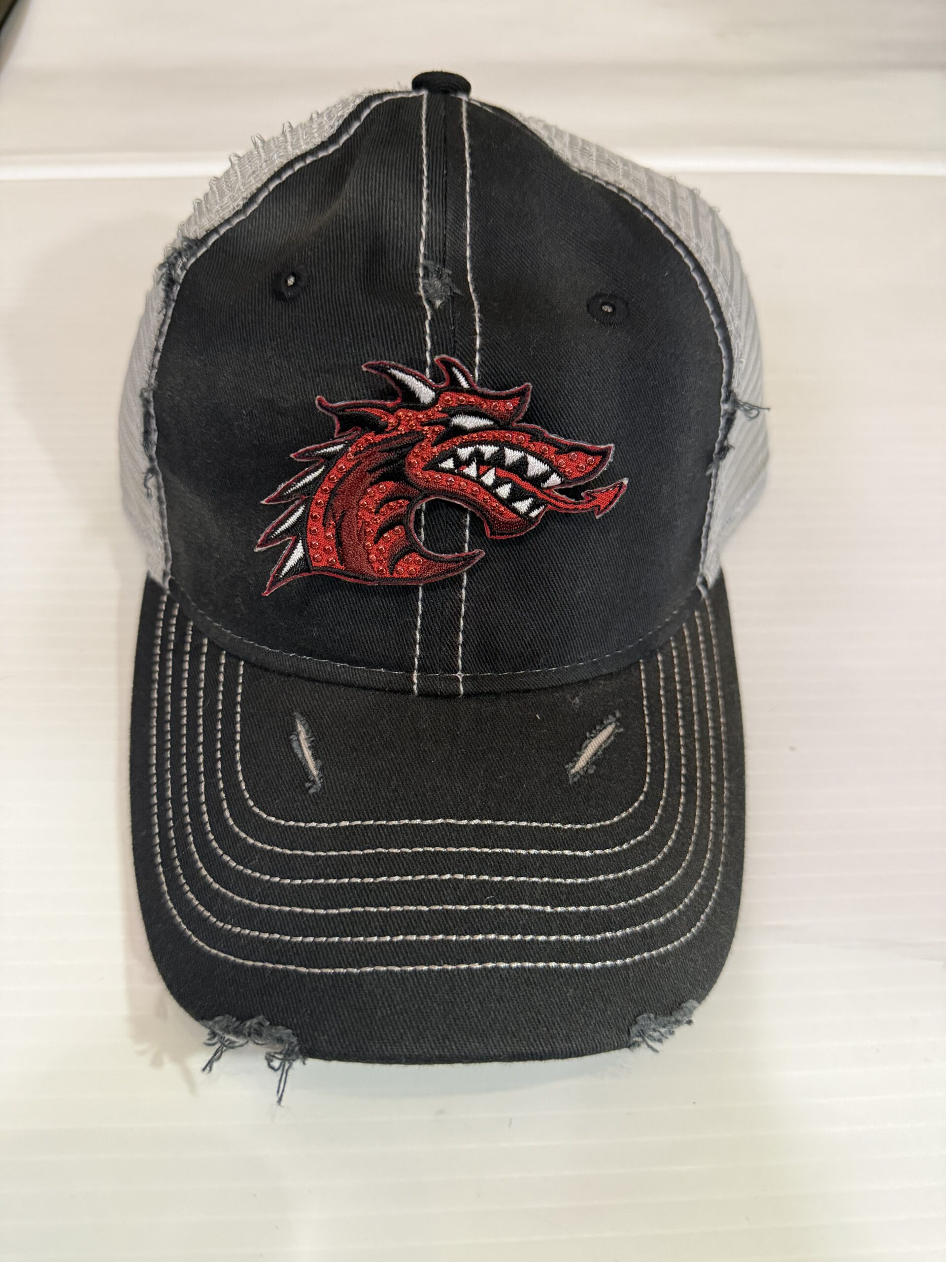 Distressed adjustable trucker hat with bling logo