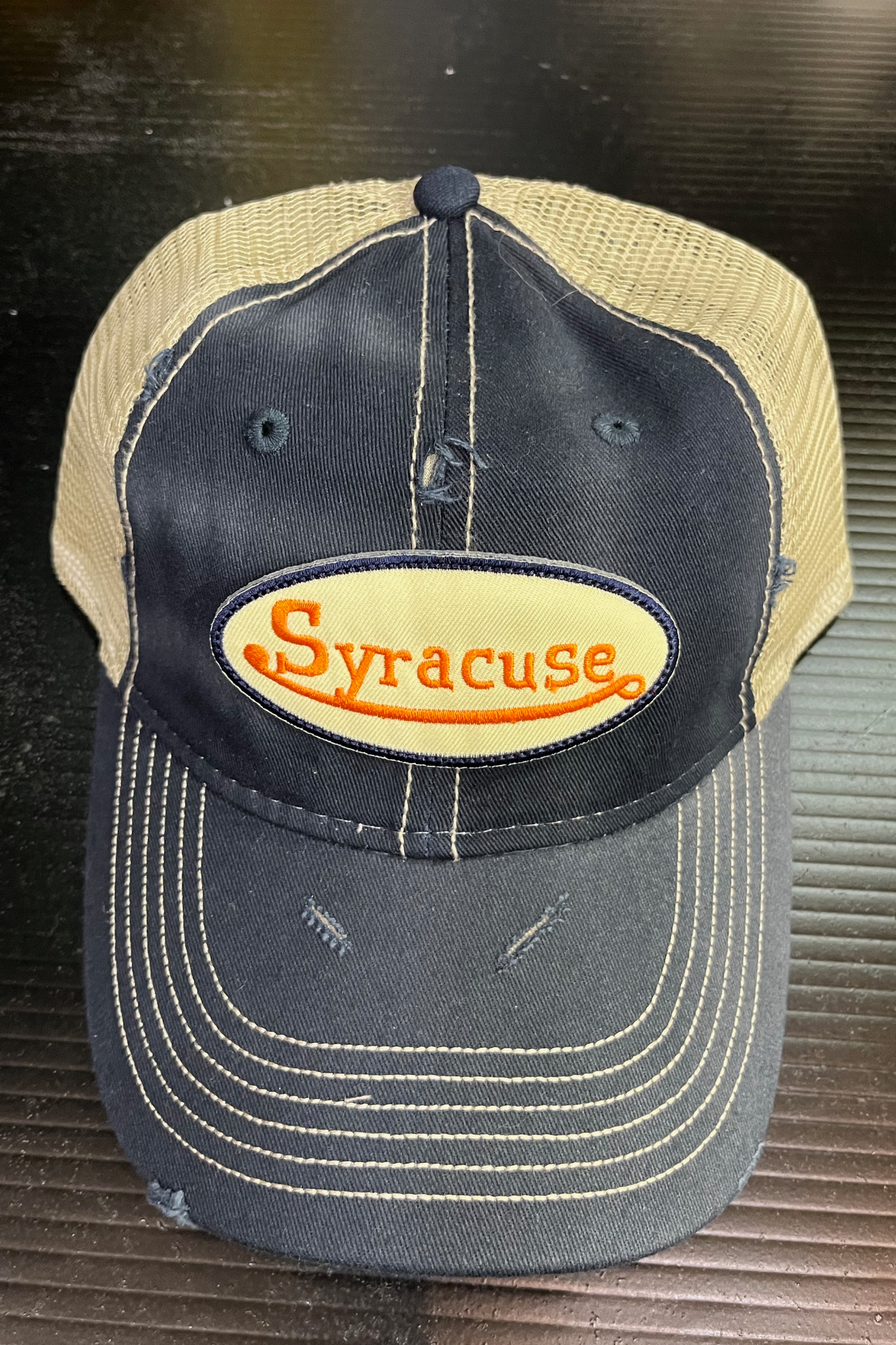 Deconstructed vintage unisex trucker hat with rips and college logo