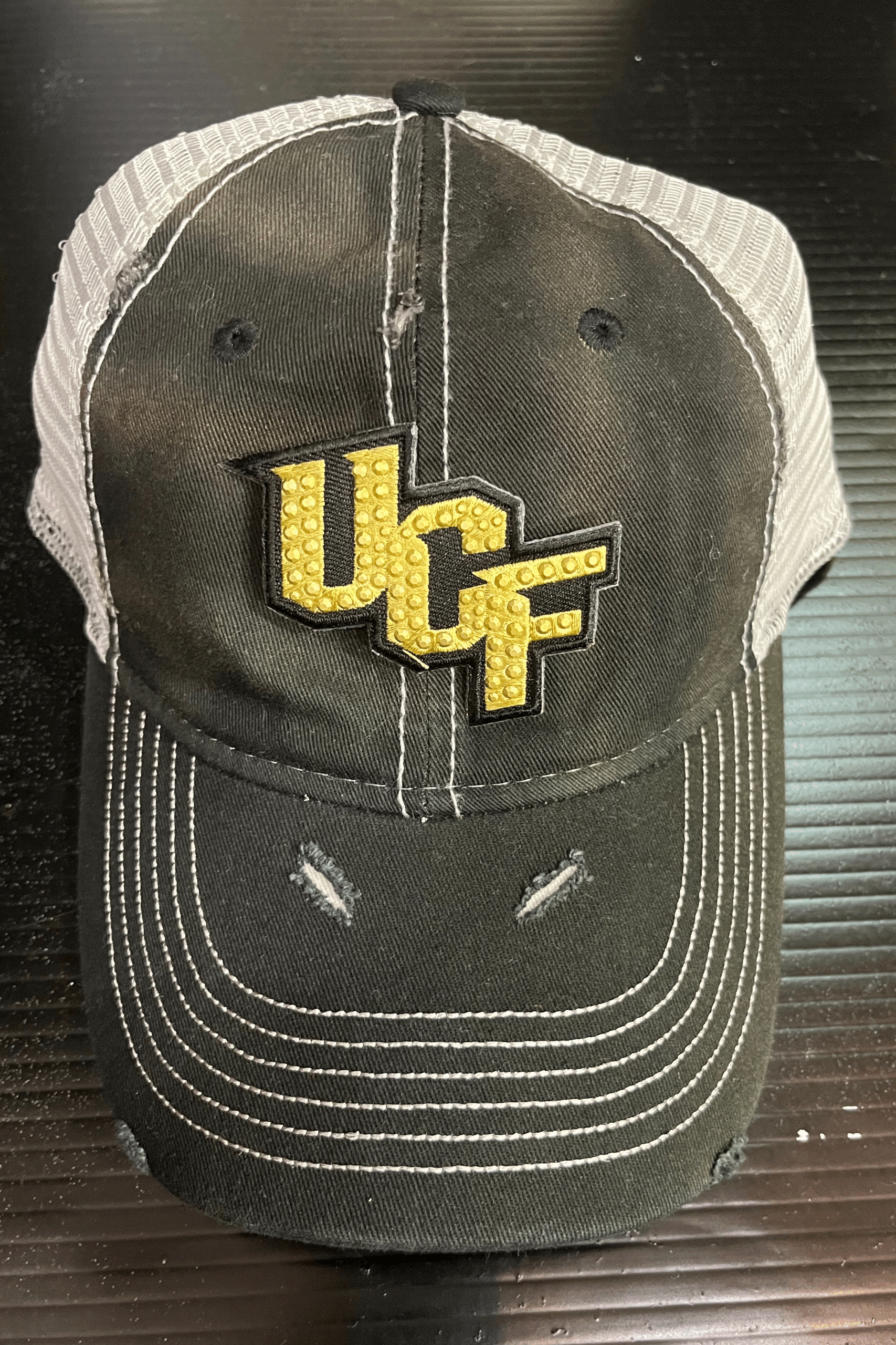 Deconstructed vintage unisex trucker hat with rips and bling college logo