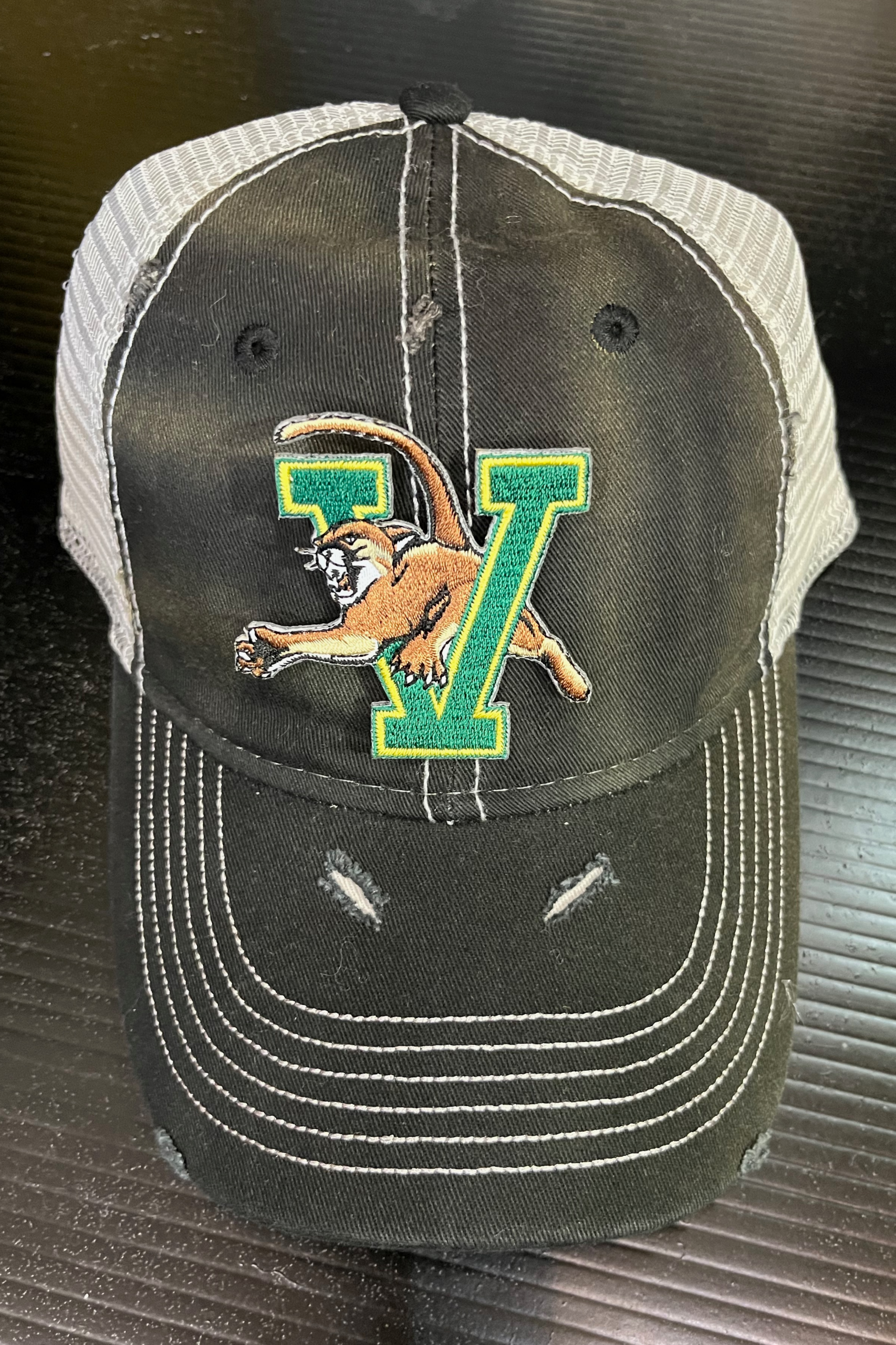 Deconstructed vintage unisex trucker hat with rips and college logo