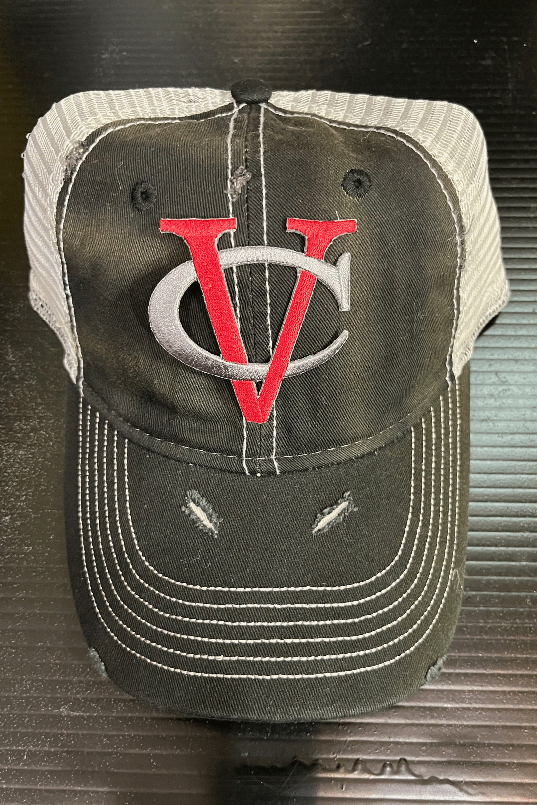Deconstructed vintage unisex trucker hat with rips and college logo