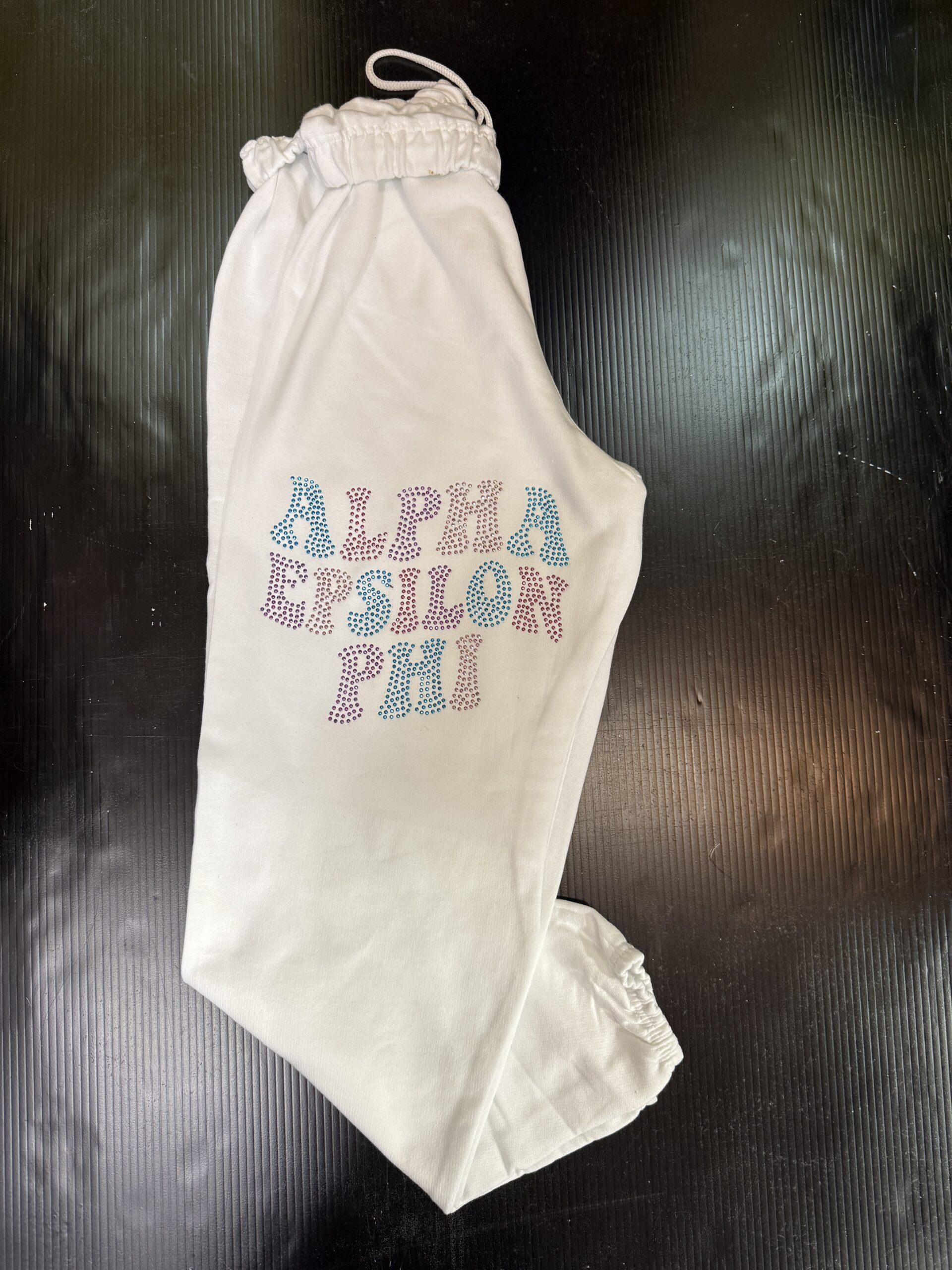 Soft fleece sweatpants with bling sorority applique on the leg. Elastic bottom. 50% cotton/ 50% polyester.