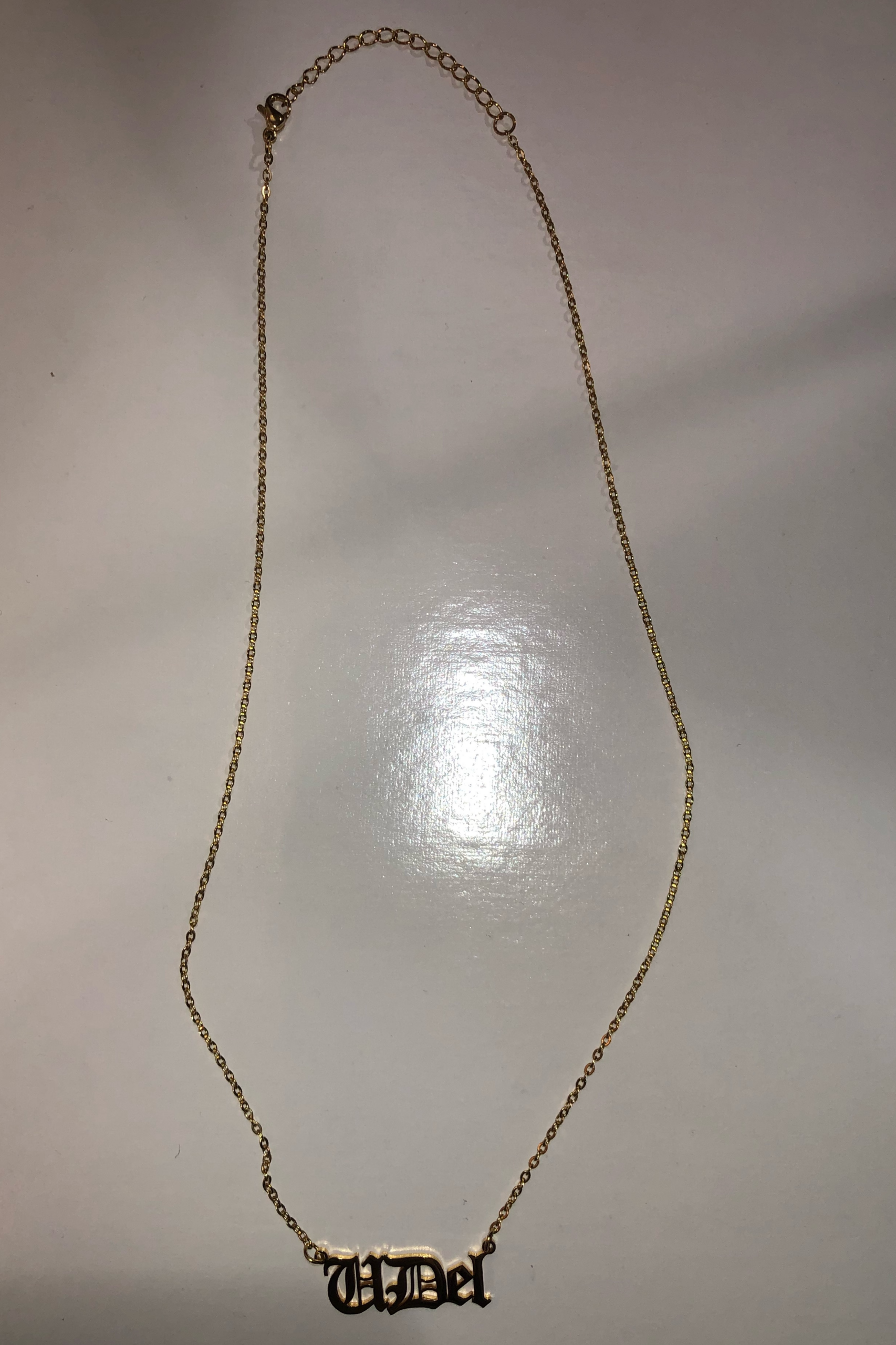 Gold College nameplate with 18 inch chain and 1.5 inch extender. Made from Stainless Steel.