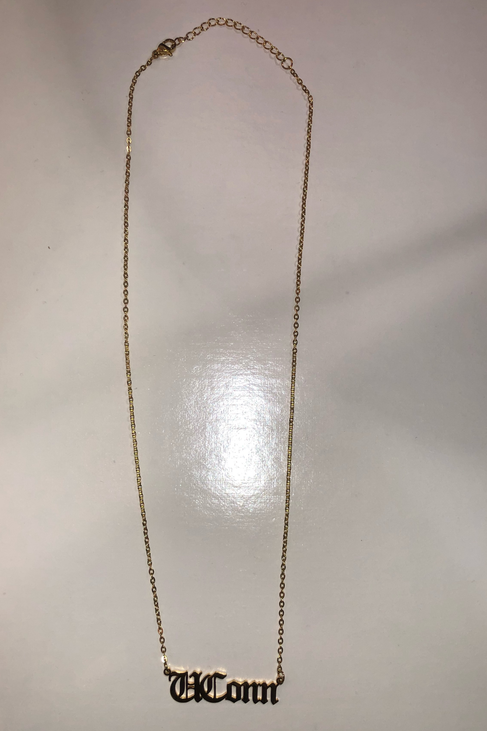 Gold College nameplate with 18 inch chain and 1.5 inch extender. Made from Stainless Steel.