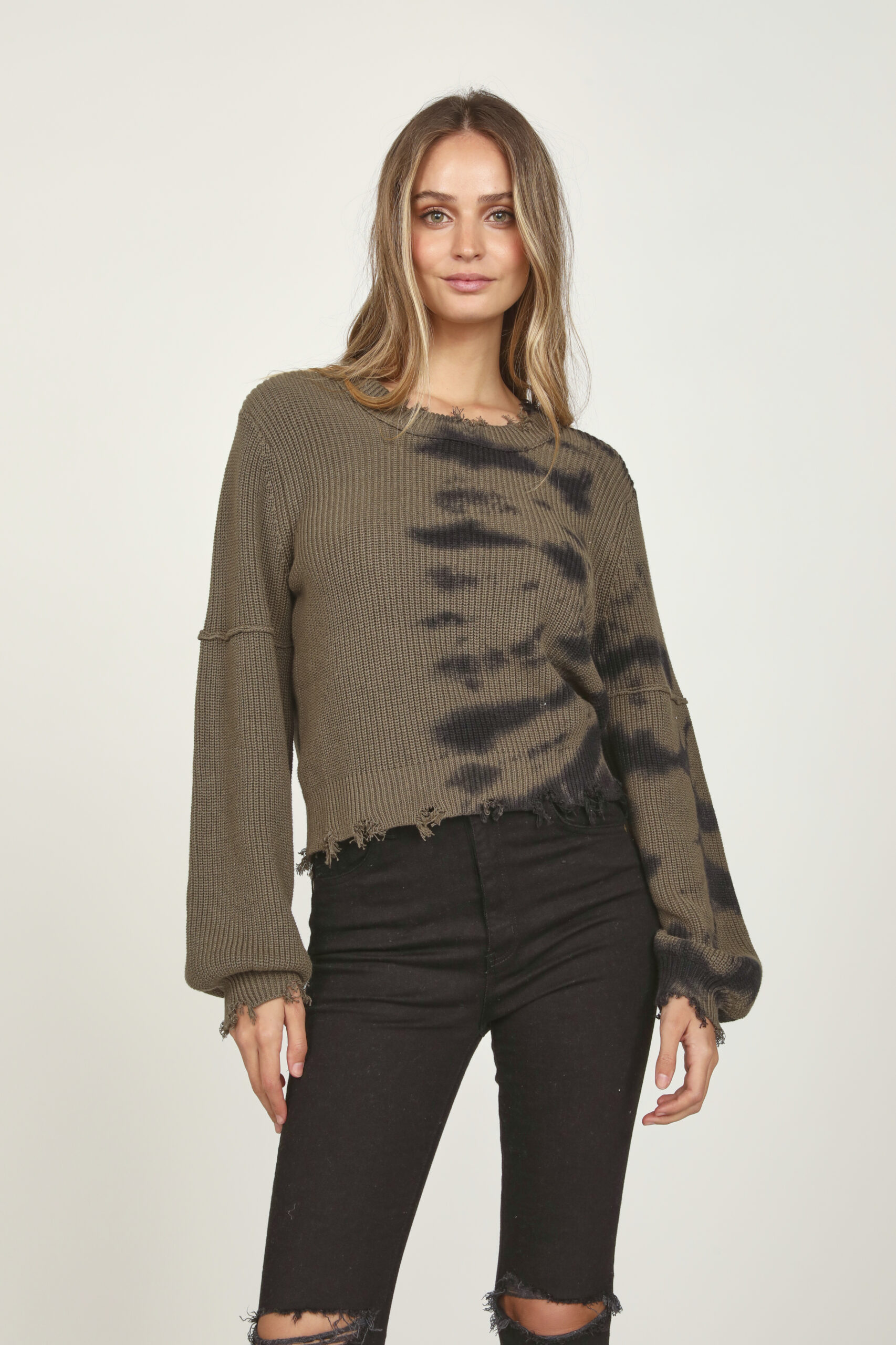 Half solid/ Half tie dyed crewneck cotton sweater with destessed neck, sleeves, and bottom.