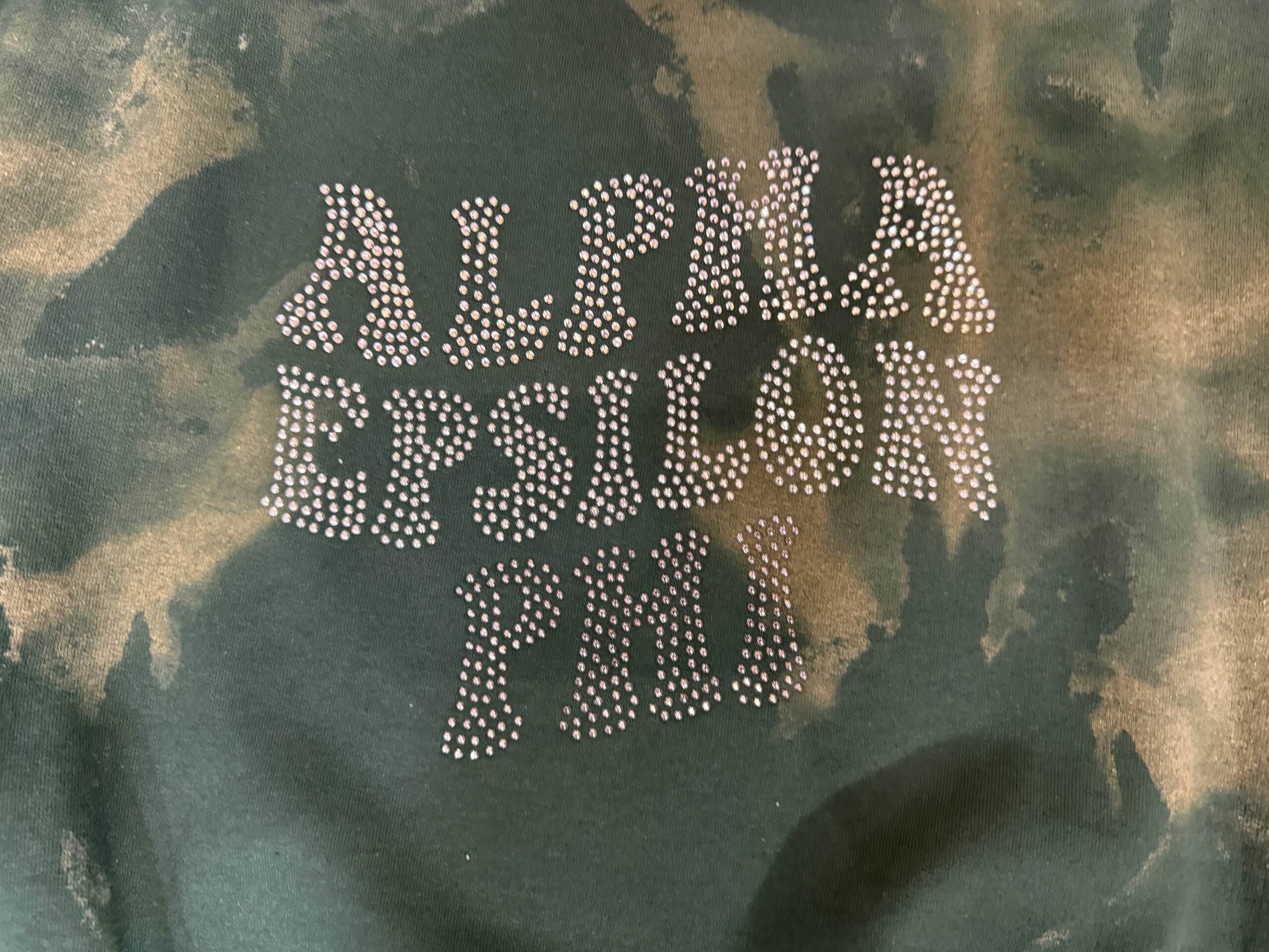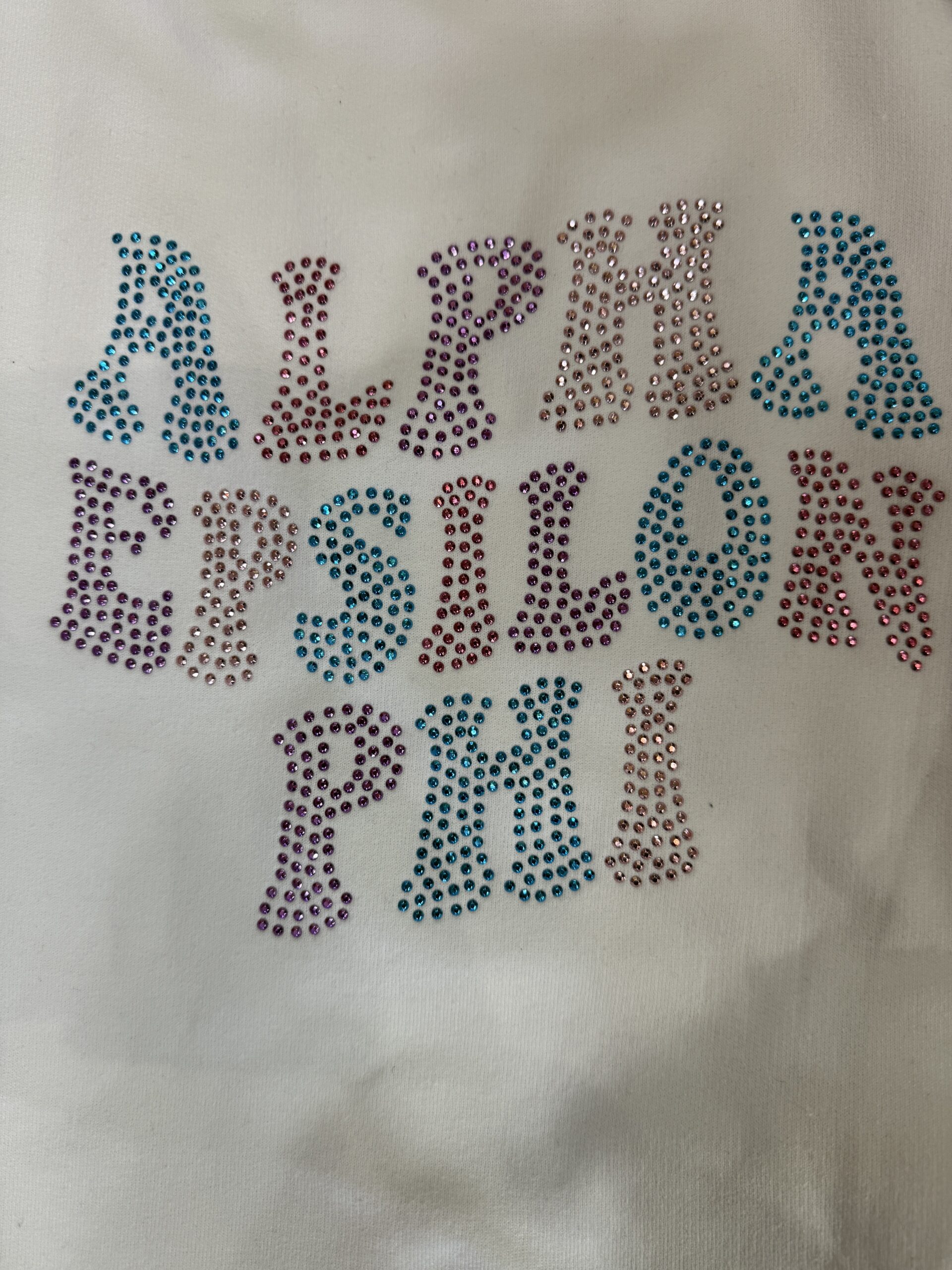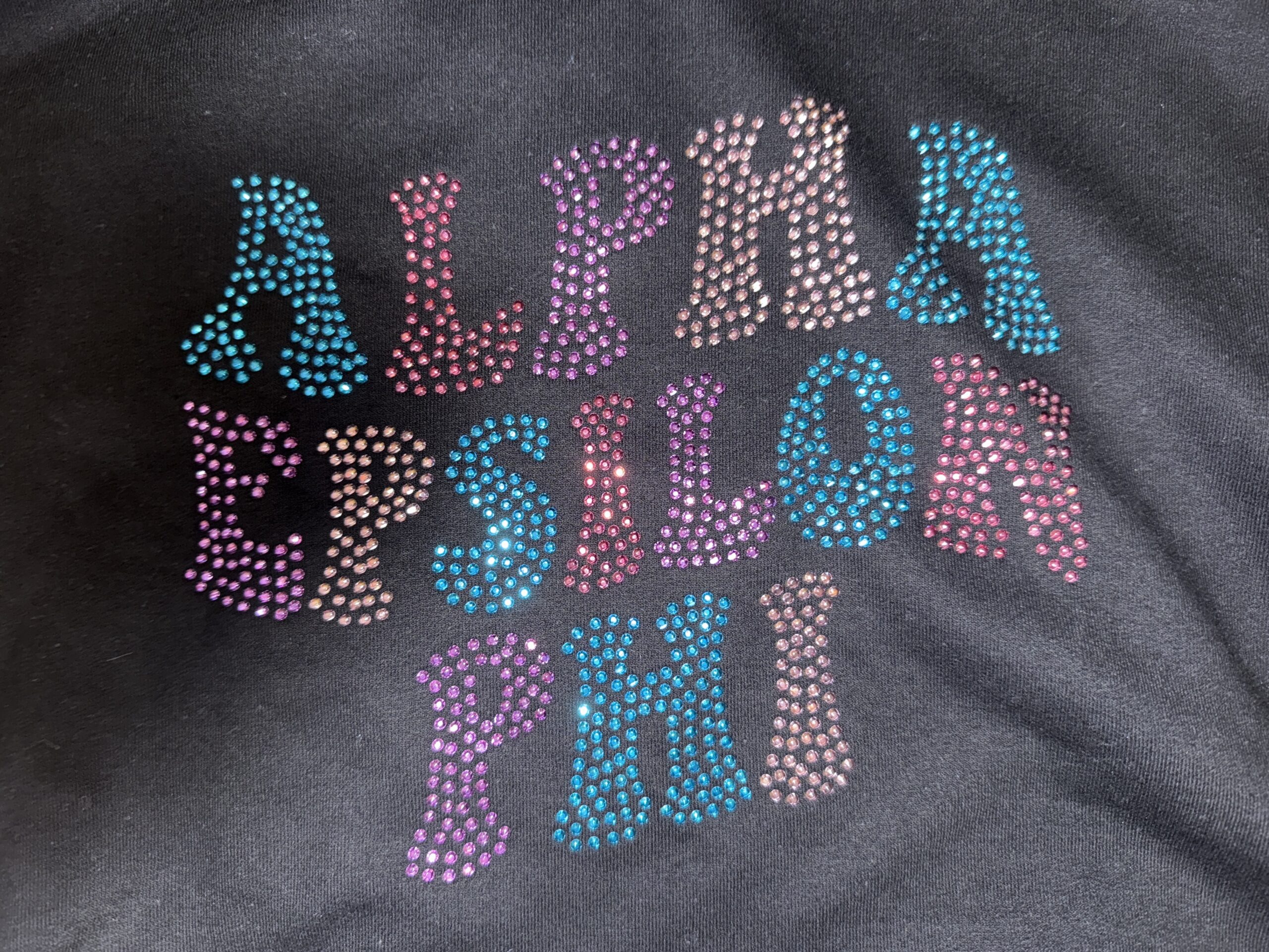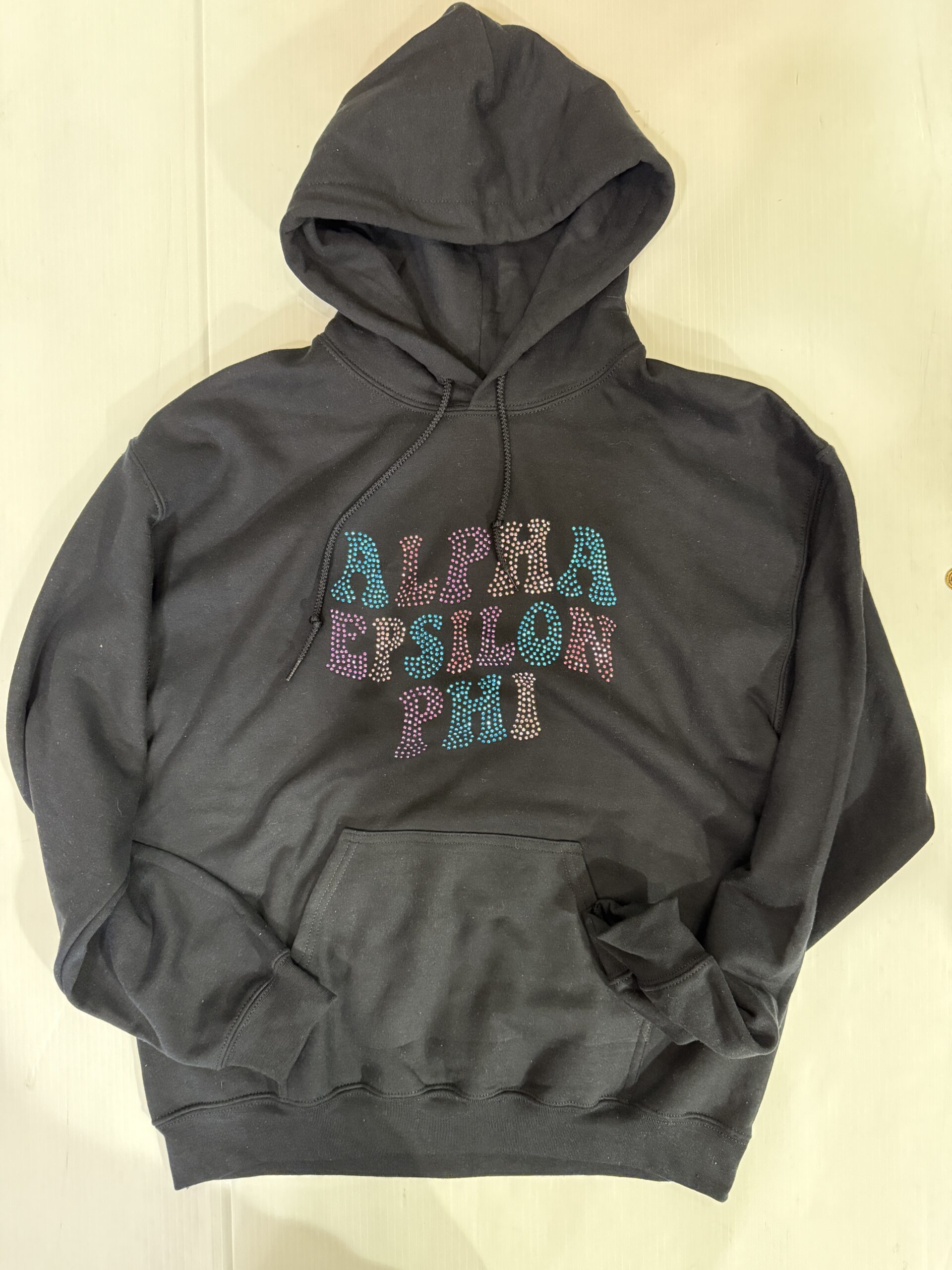 Soft hooded sweatshirt with bling sorority applique on the front. Banded bottom and kangaroo pocket. 50% cotton/ 50% polyester.