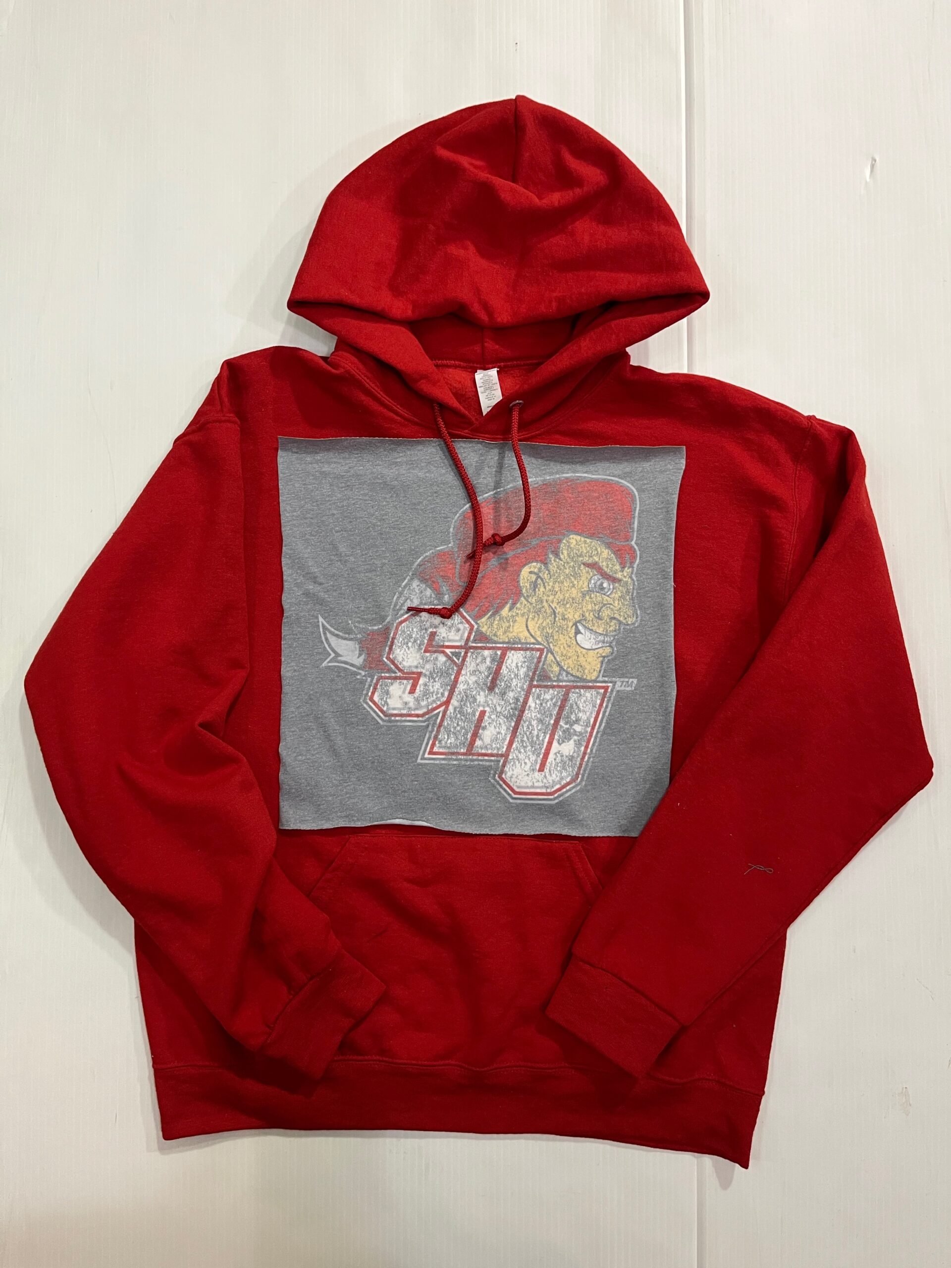Soft hooded sweatshirt with vintage Tee Square sewn on the front. Banded bottom and kangaroo pocket. 50% cotton/ 50% polyester.