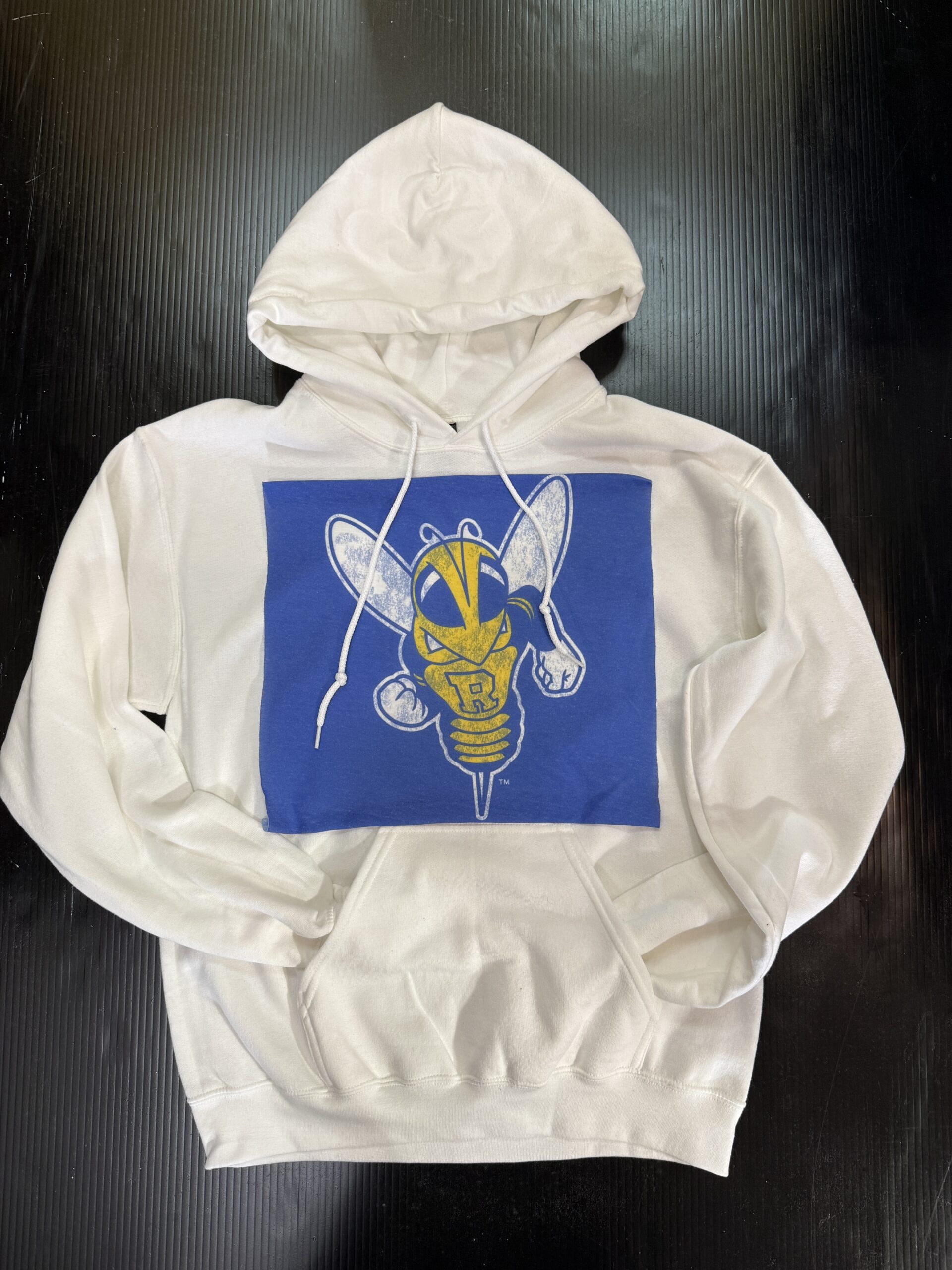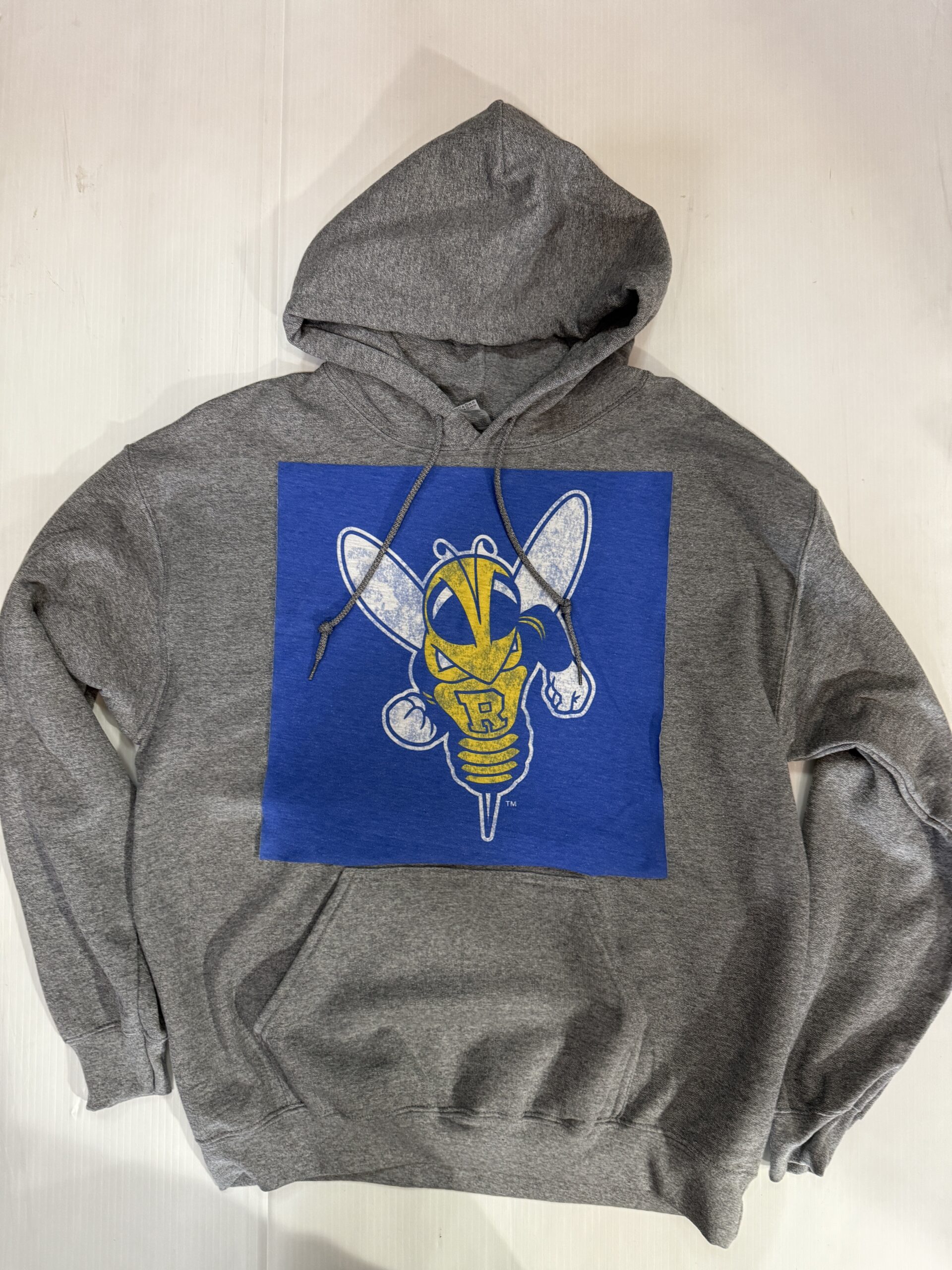 Soft hooded sweatshirt with vintage Tee Square sewn on the front. Banded bottom and kangaroo pocket. 50% cotton/ 50% polyester.