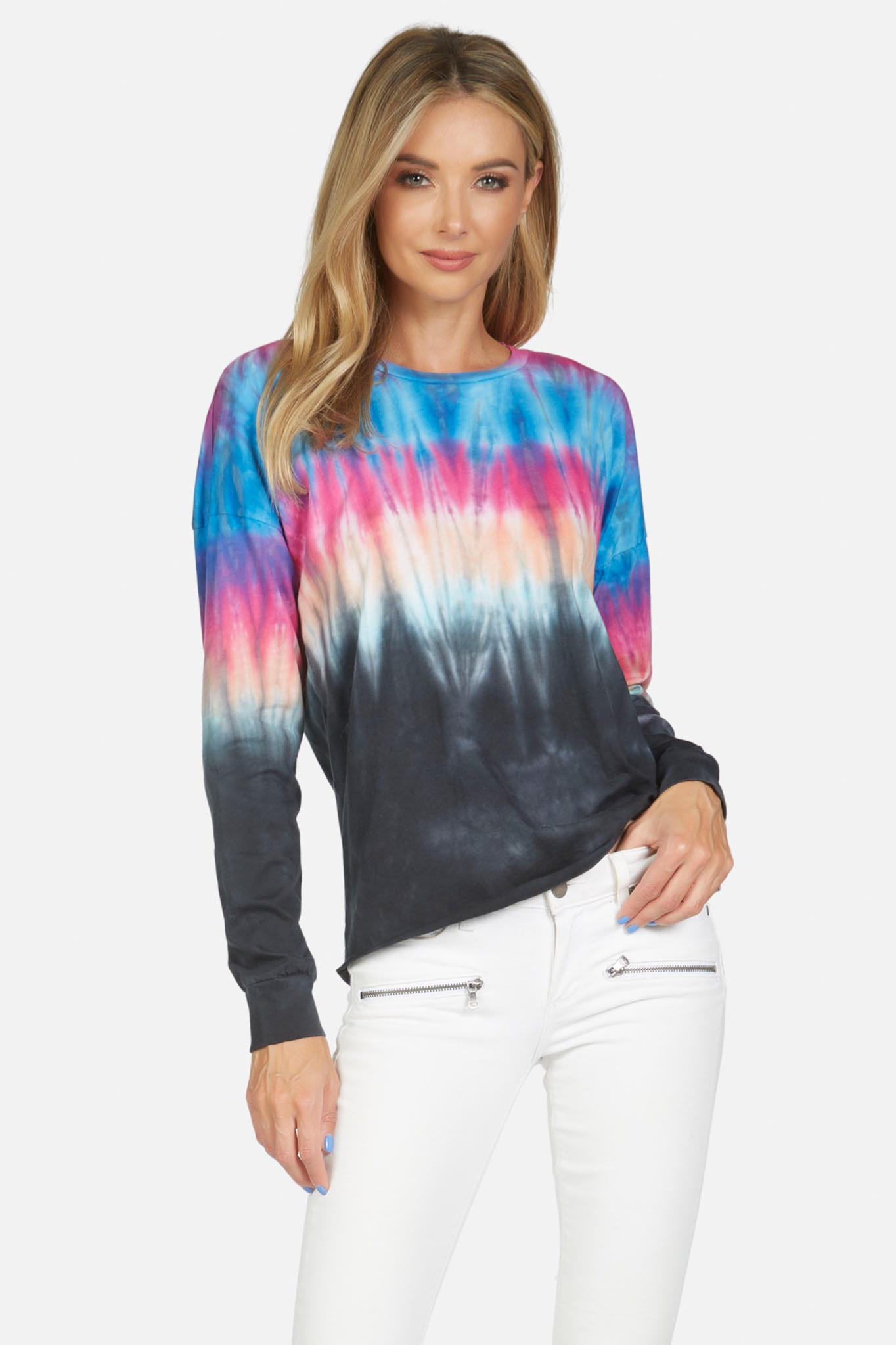 Beautiful Malibu Sunset Tie Dye crewneck long sleeve tee with drop shoulder and raw cut bottom.