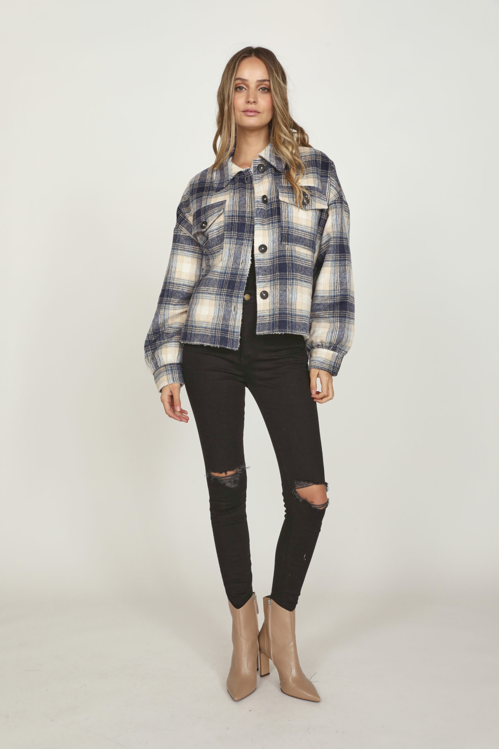 Soft fur lined flannel plaid button-down Shacket.