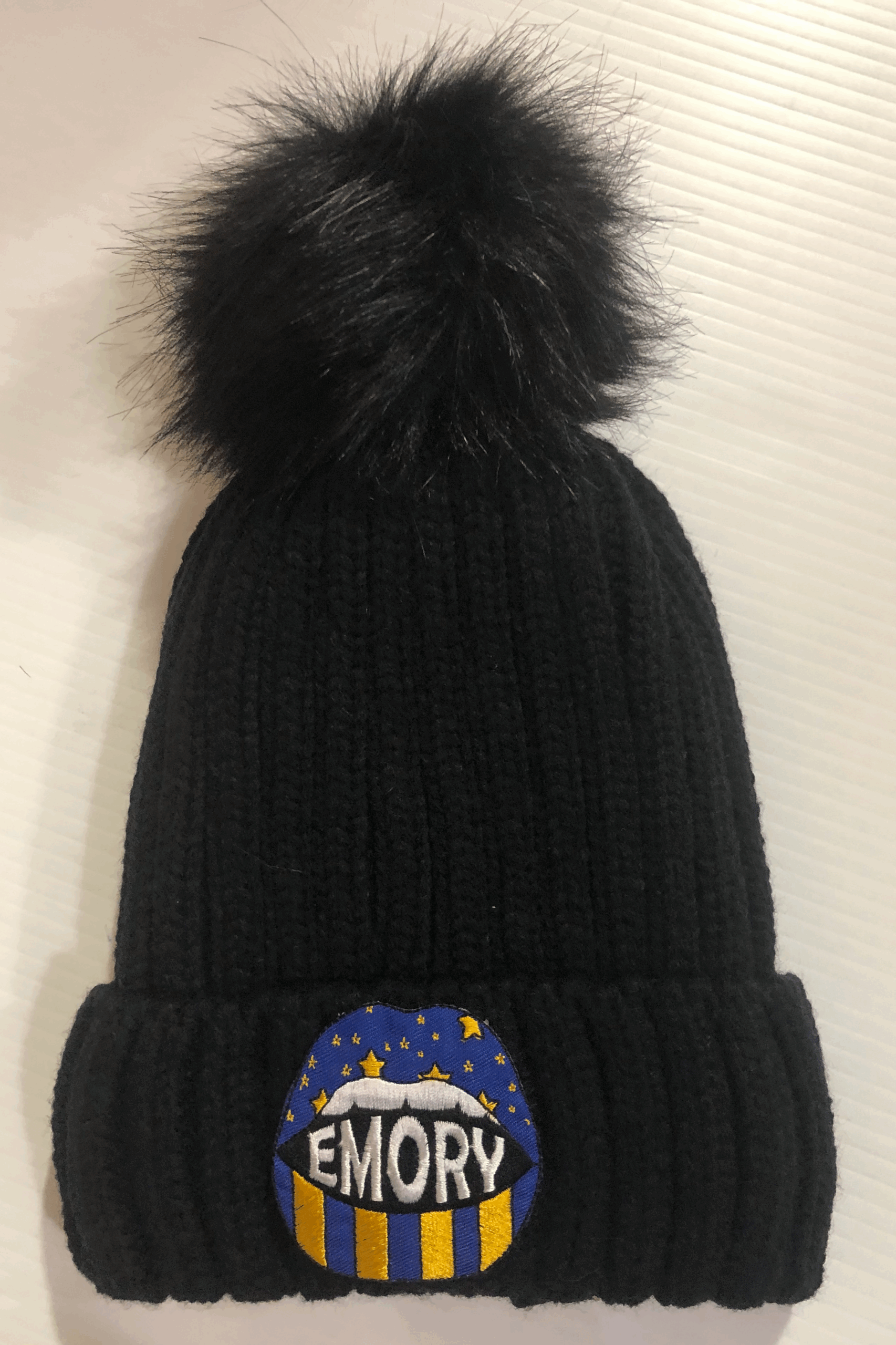 Soft Faux Fur-lined Pom Pom hat with embroidered college logo. 100% Acrylic.