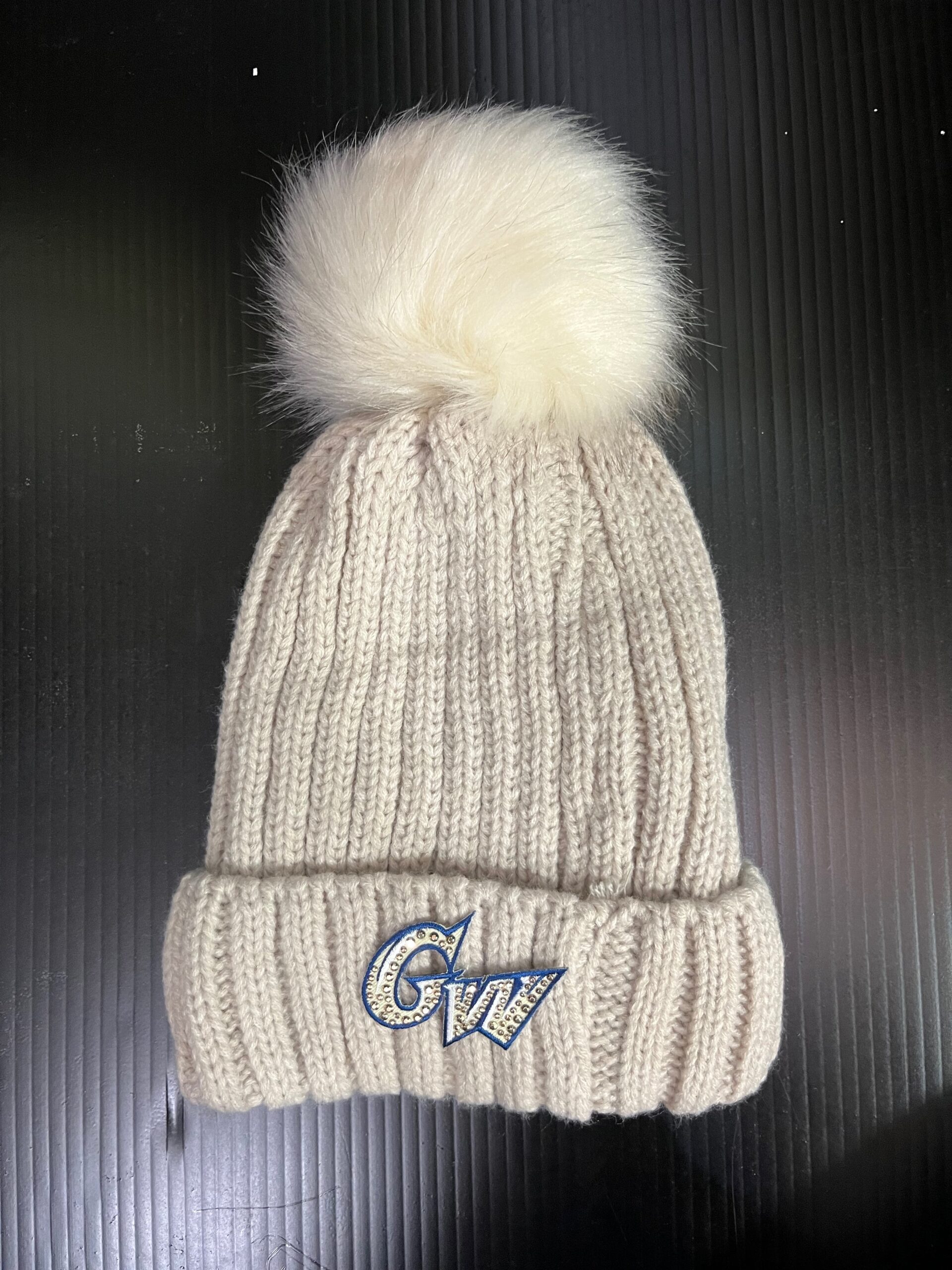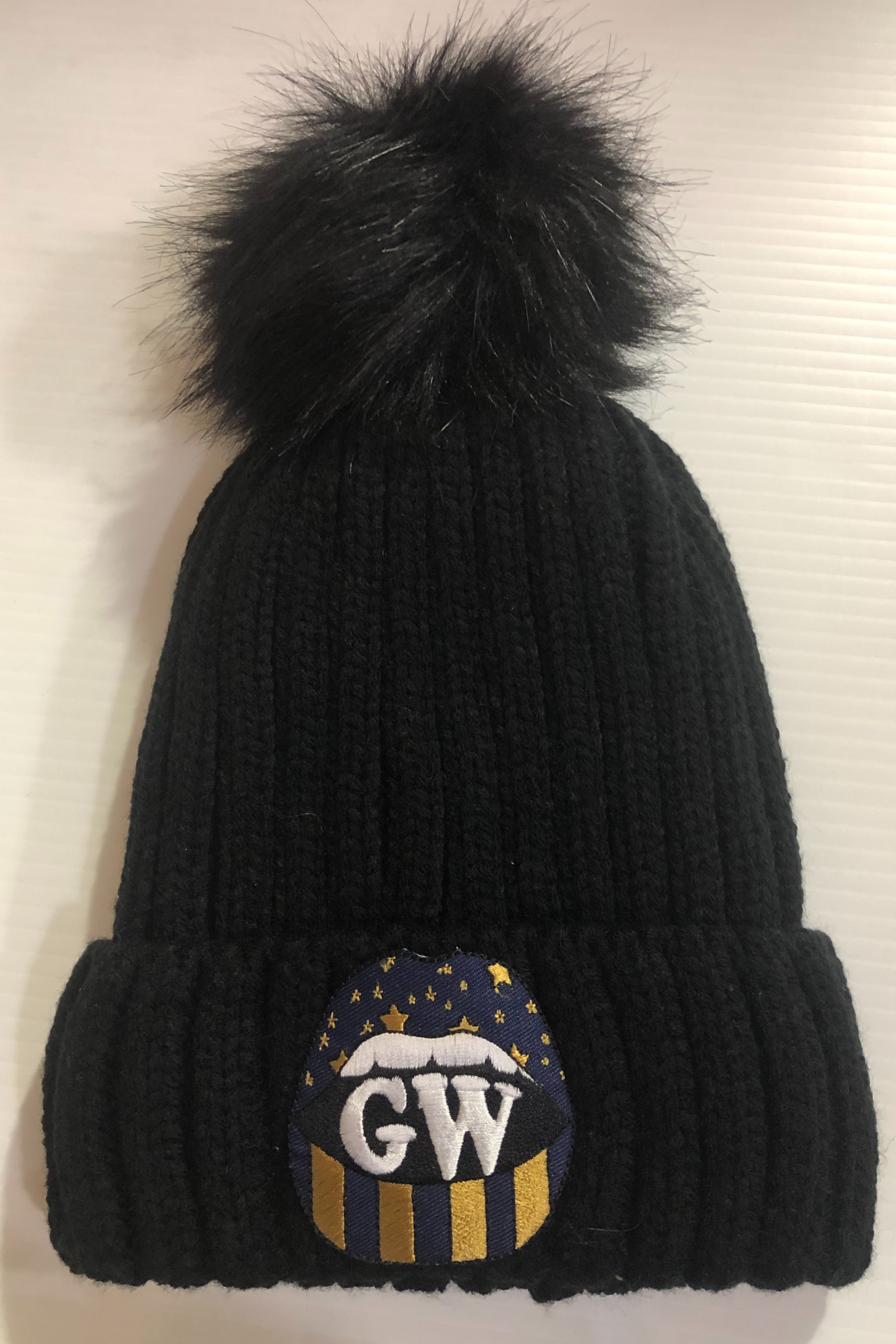 Soft Faux Fur-lined Pom Pom hat with embroidered college logo. 100% Acrylic.