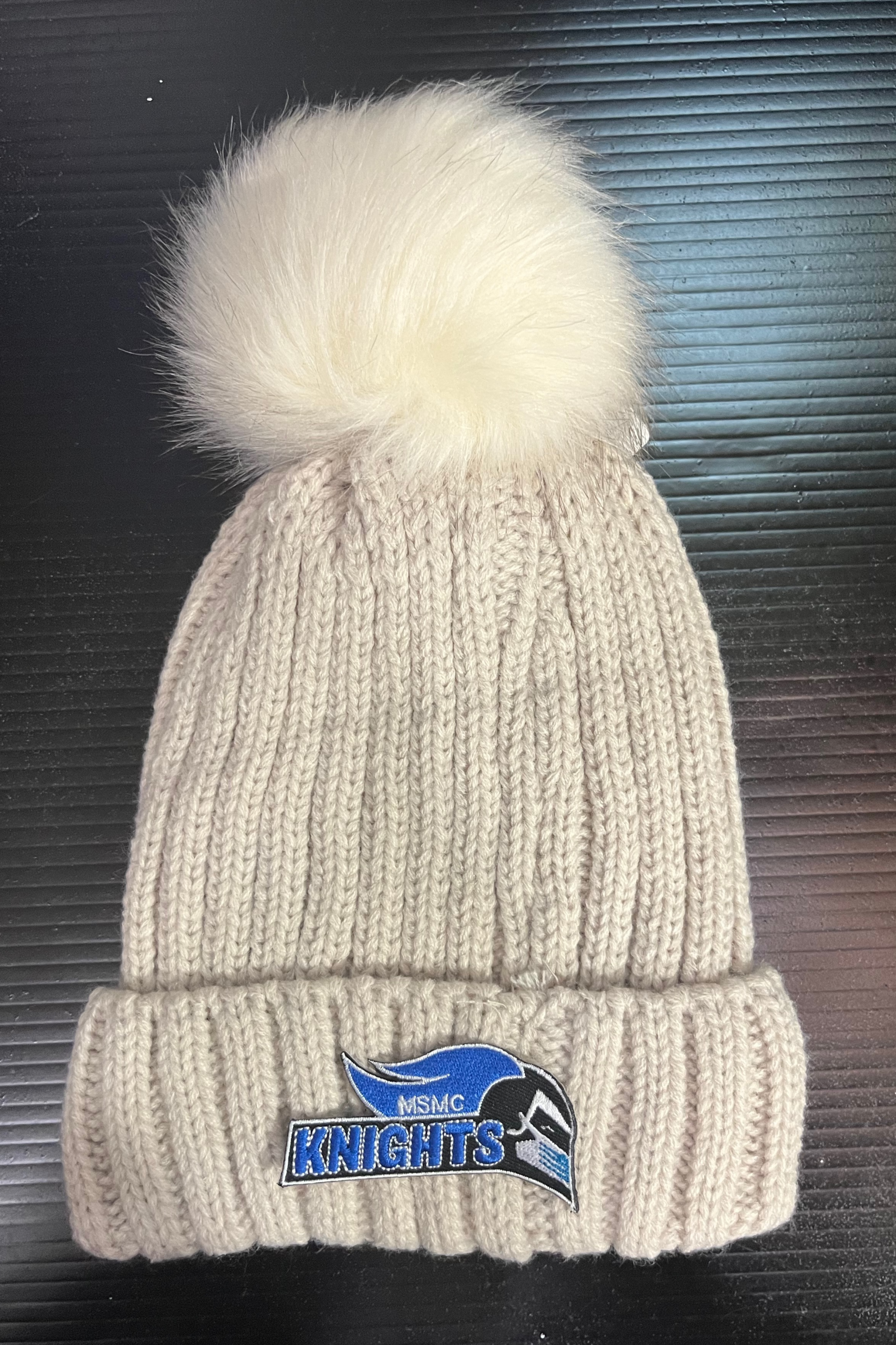Soft faux fur-lined pom pom hat with embroidered college logo. 100% acrylic.