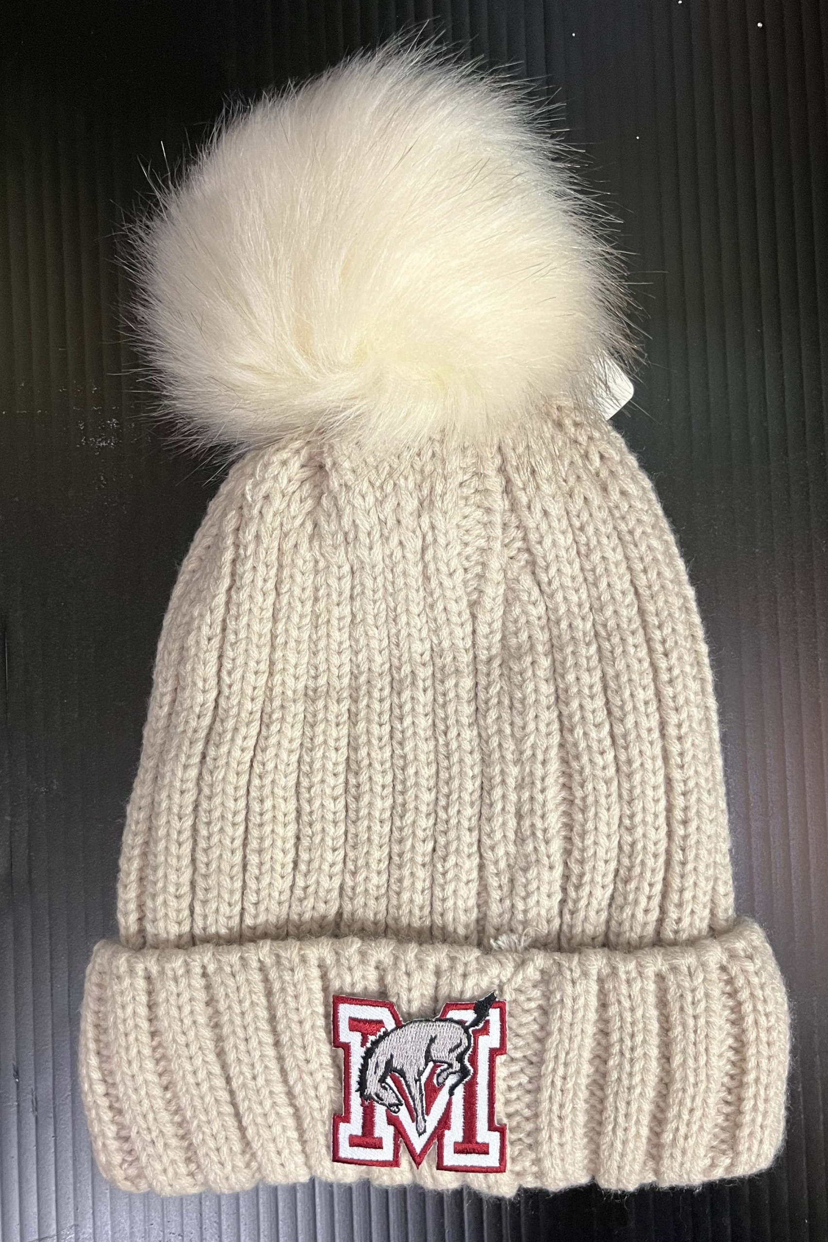 Soft faux fur-lined pom pom hat with embroidered college logo. 100% acrylic.