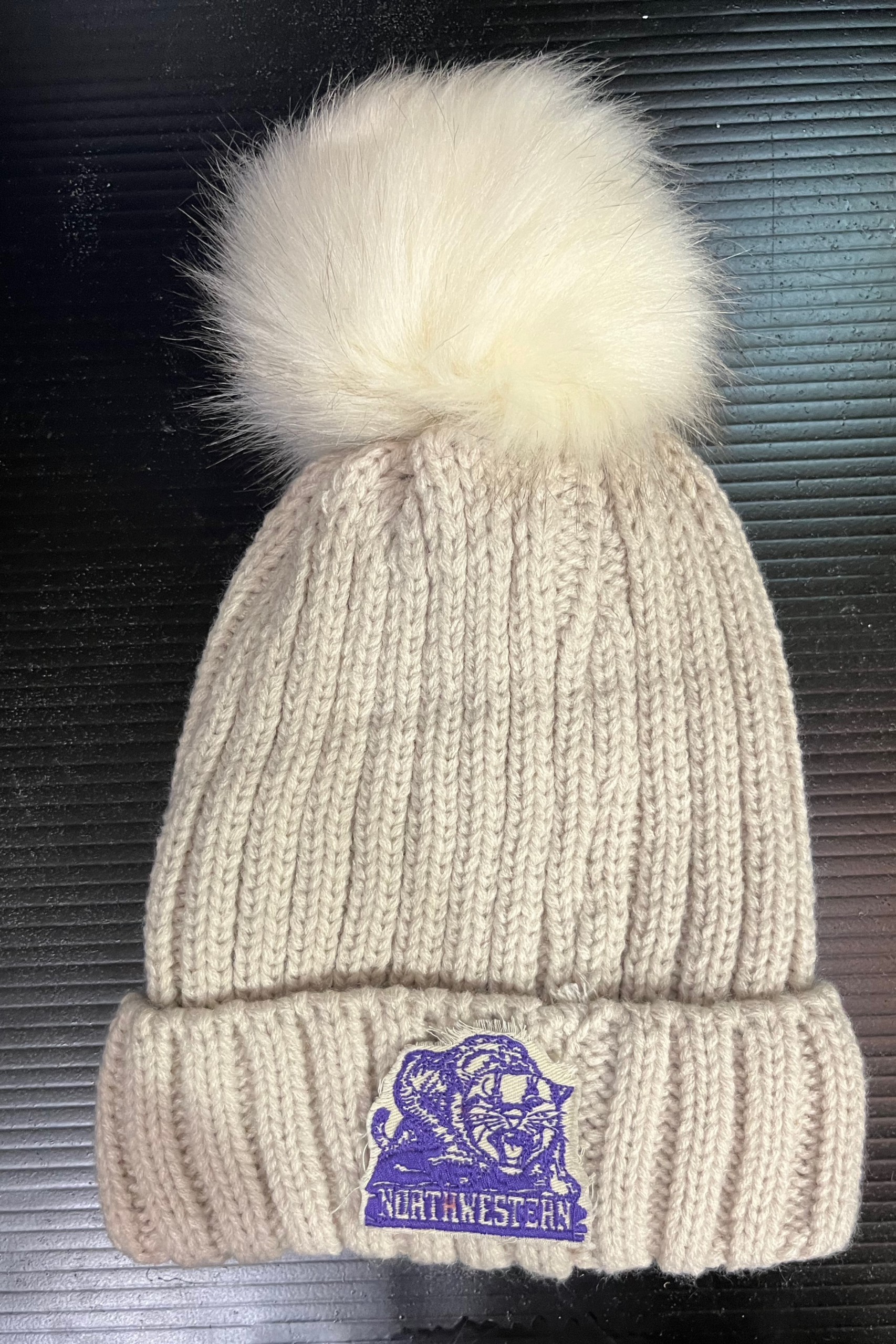 Soft faux fur-lined pom pom hat with embroidered college logo. 100% acrylic.
