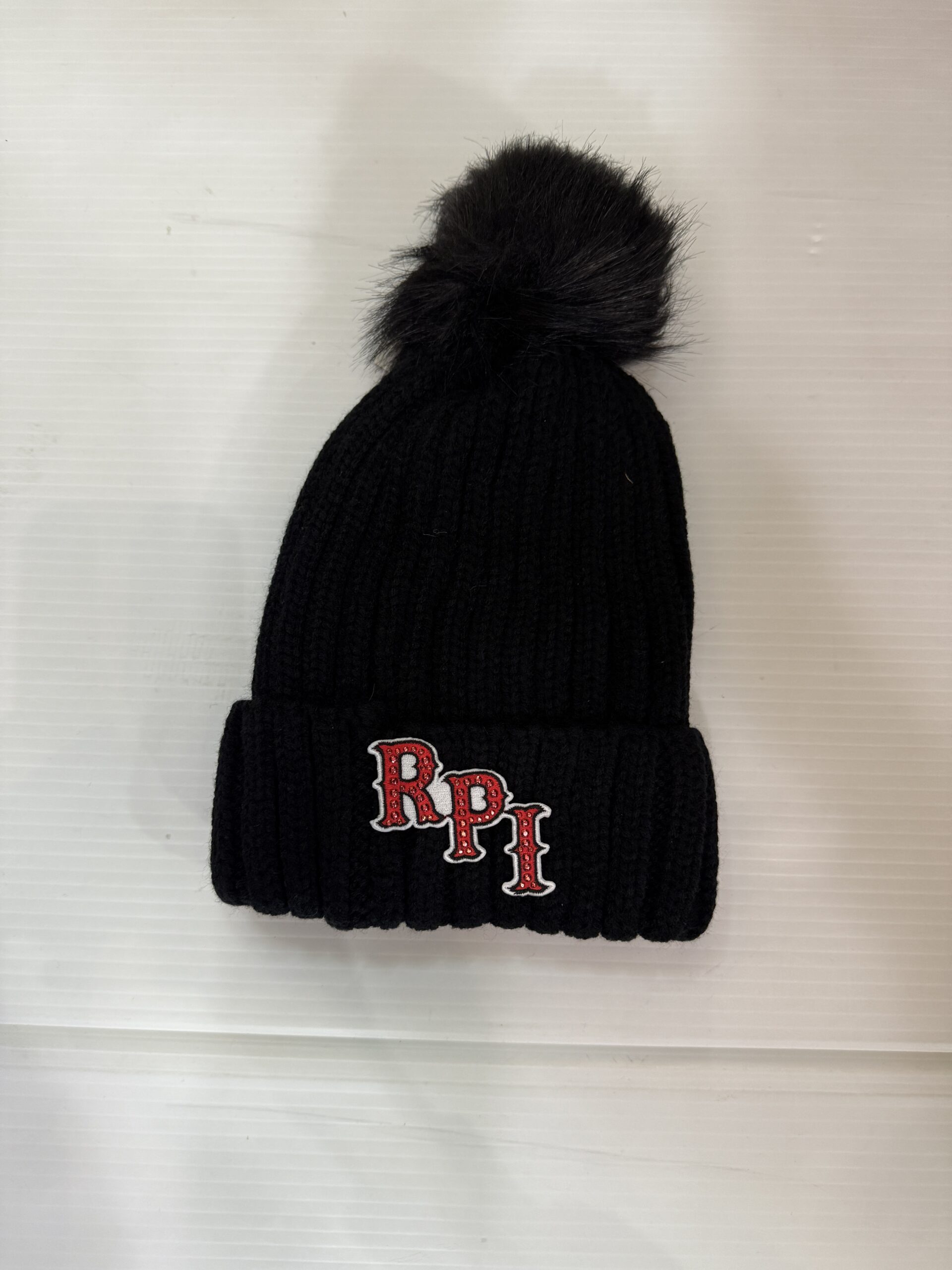 Soft faux fur-lined pom pom hat with embroidered college logo. 100% acrylic.