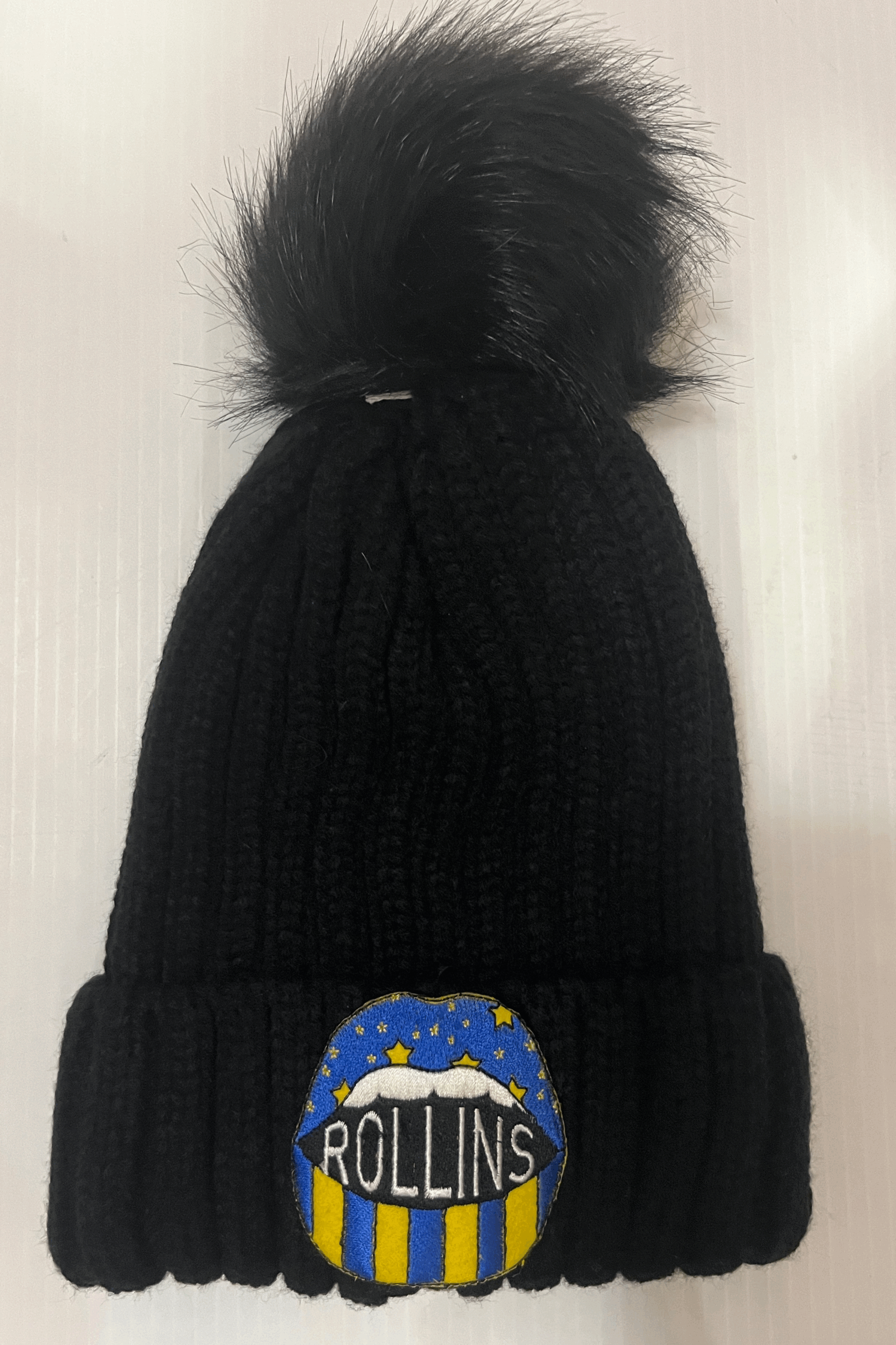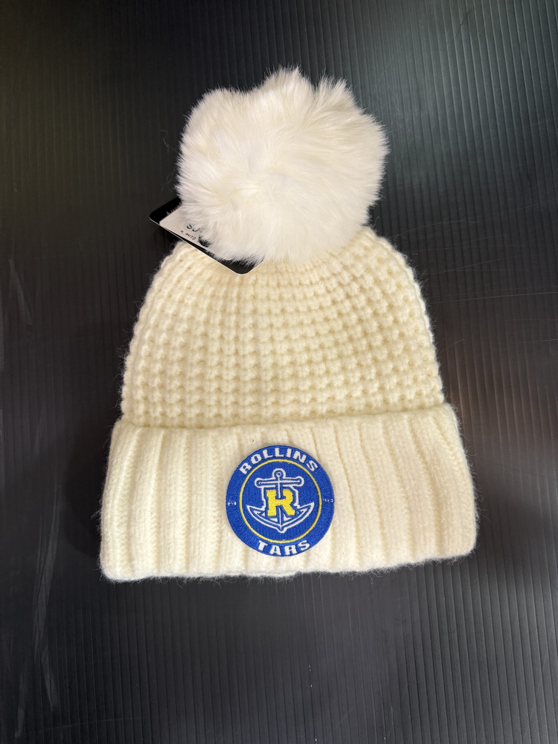 Soft faux fur-lined pom pom hat with embroidered college logo. 100% acrylic.