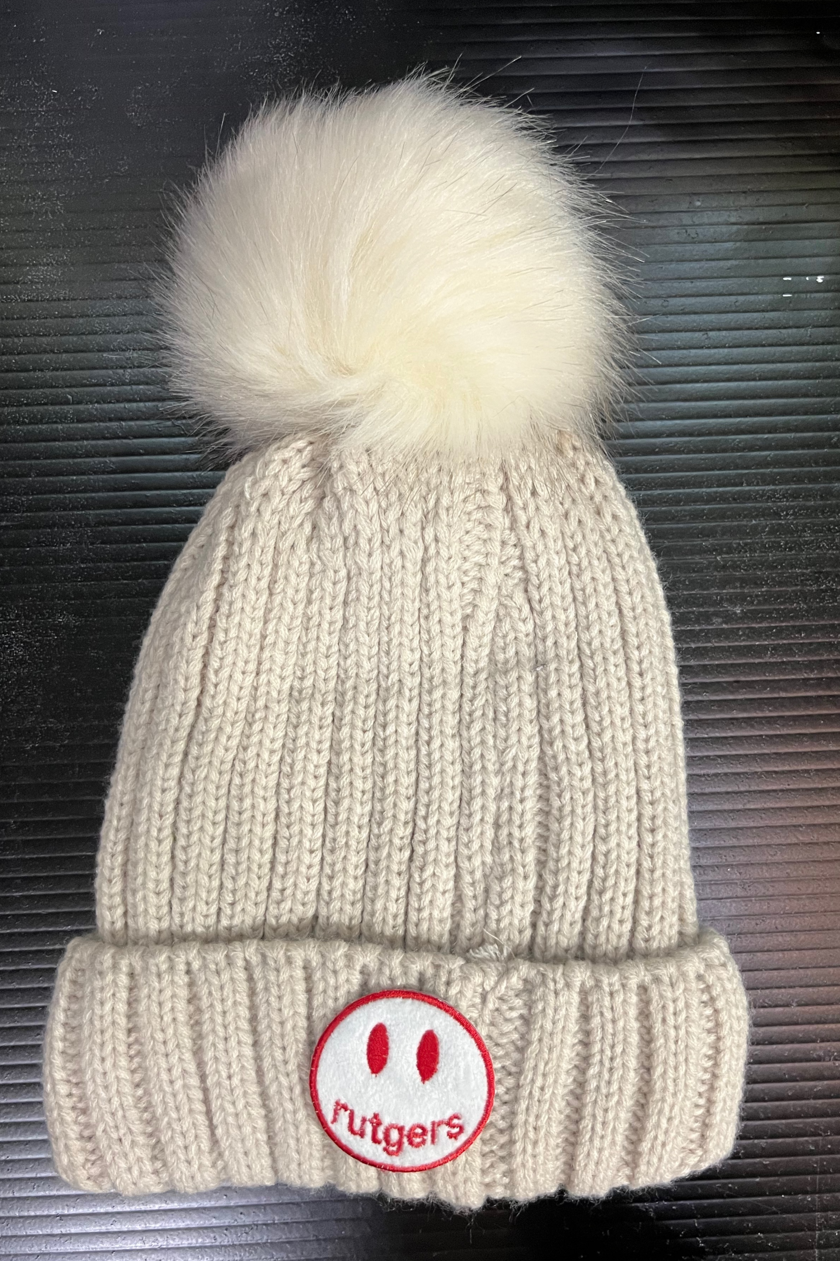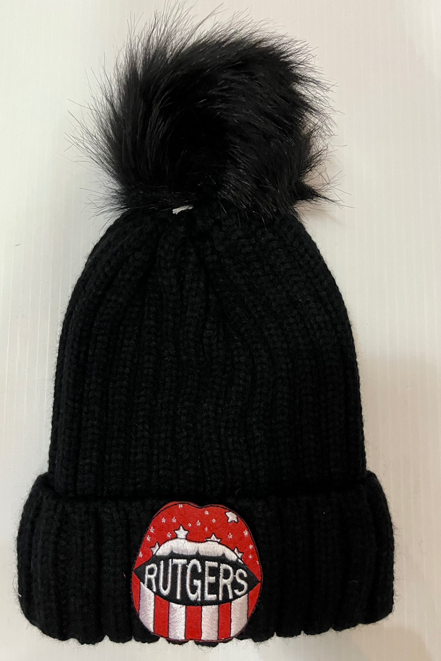 Soft faux fur-lined pom pom hat with embroidered college logo. 100% acrylic.