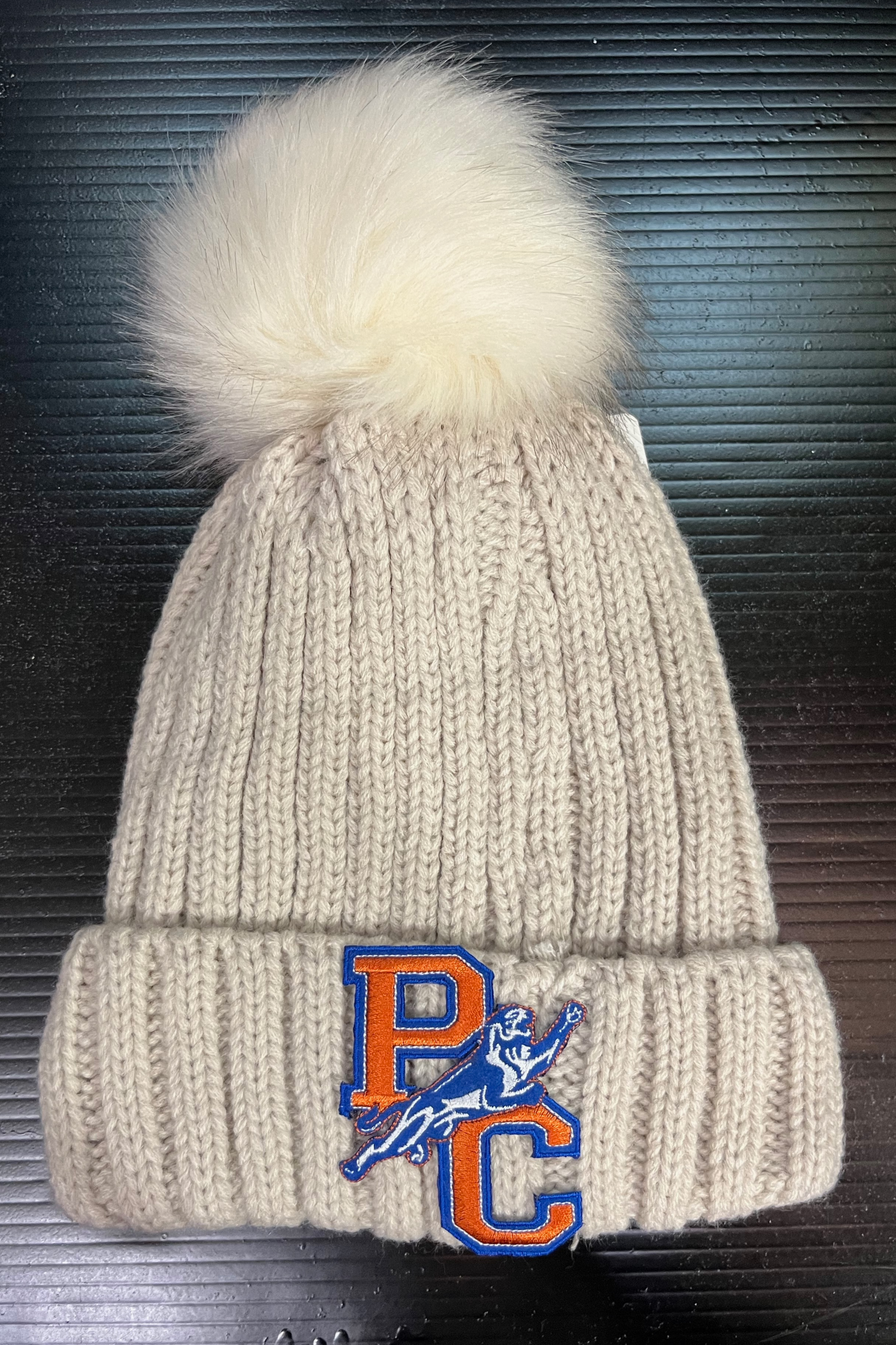 Soft faux fur-lined pom pom hat with embroidered college logo. 100% acrylic.