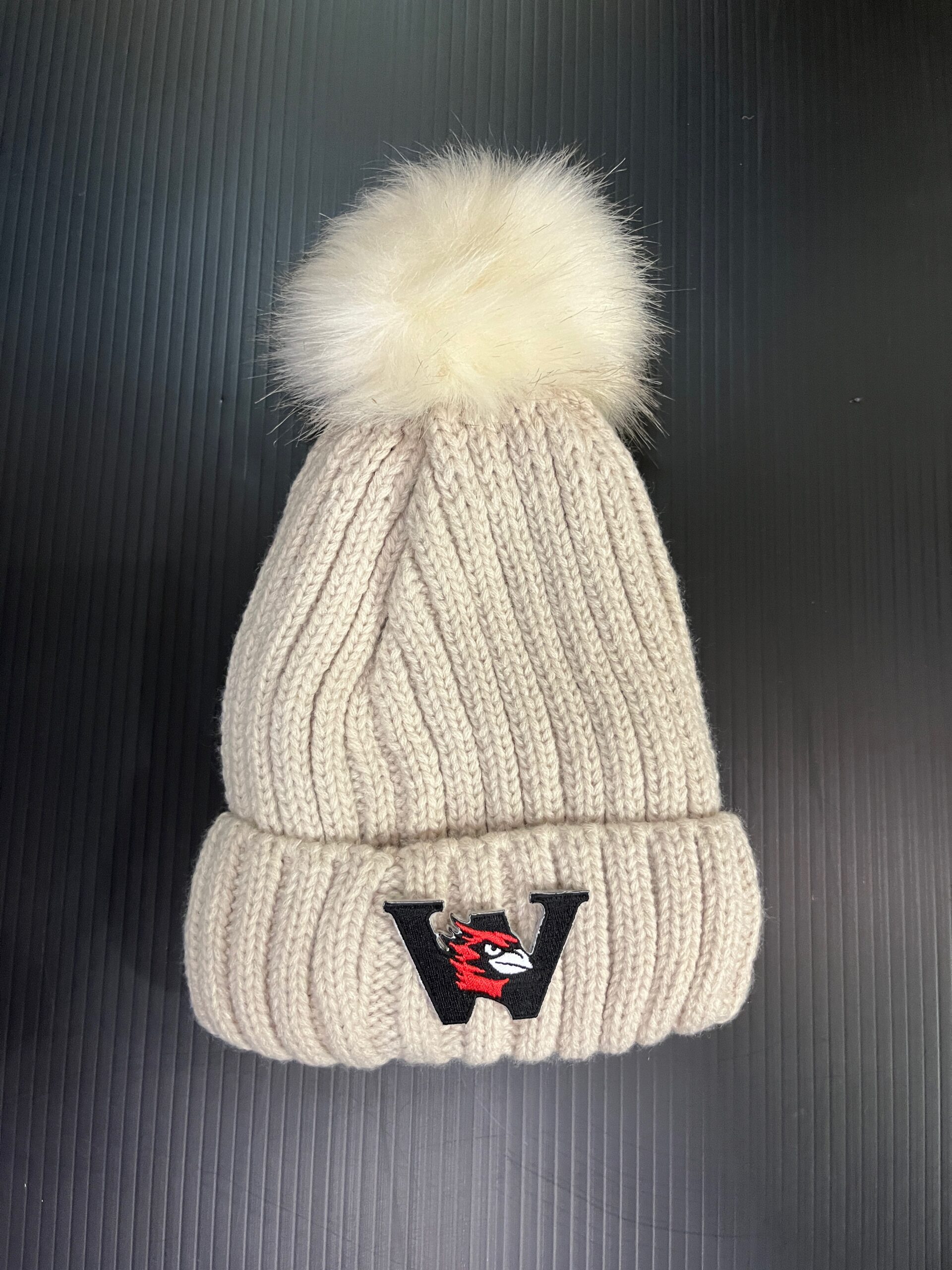 Soft faux fur-lined pom pom hat with embroidered college logo. 100% acrylic.