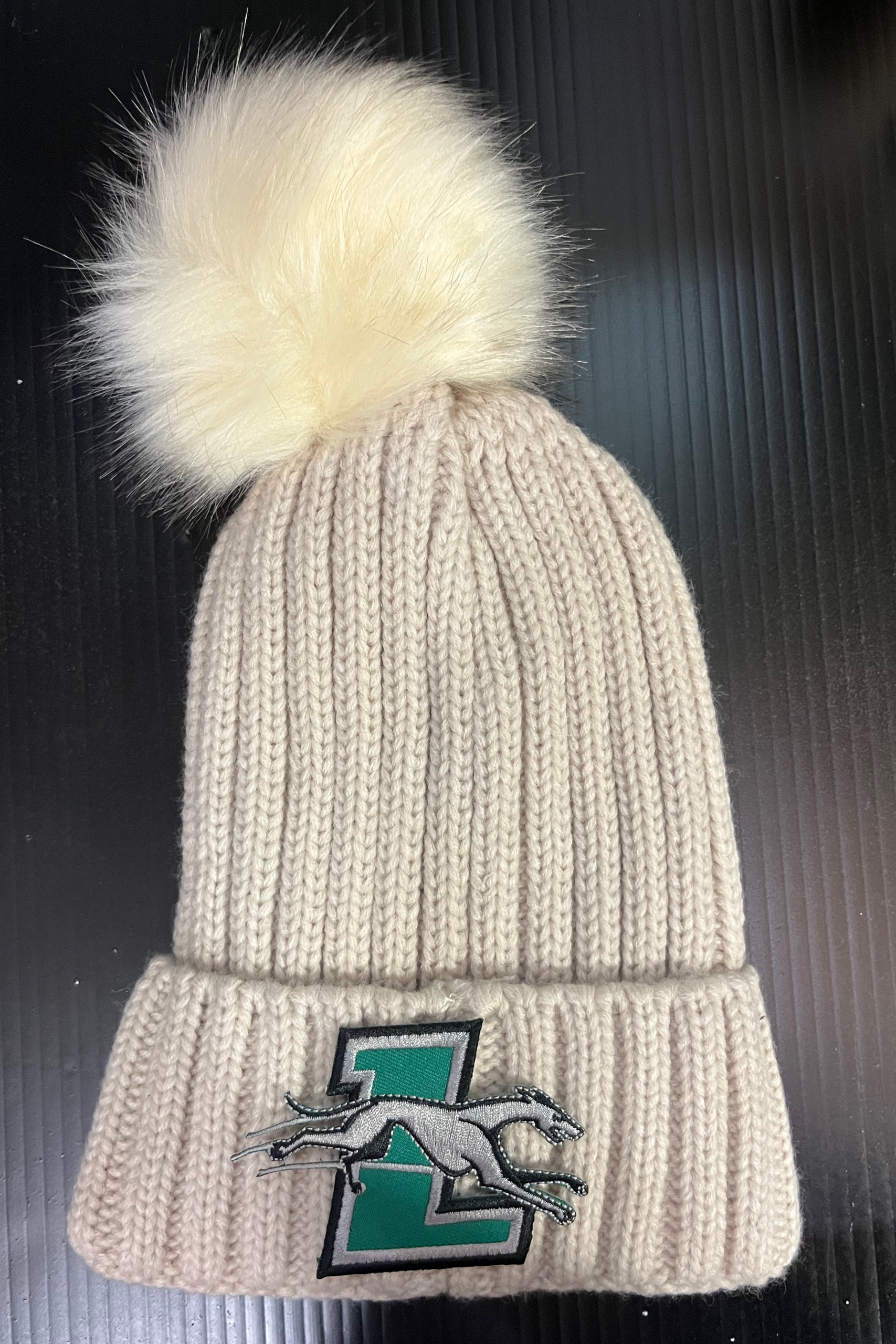 Soft faux fur-lined pom pom hat with embroidered college logo. 100% acrylic.