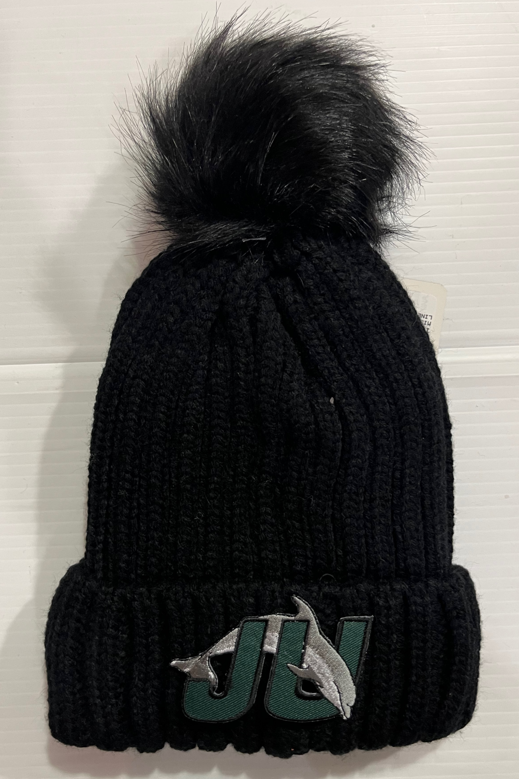 Soft faux fur-lined pom pom hat with embroidered college logo. 100% acrylic.