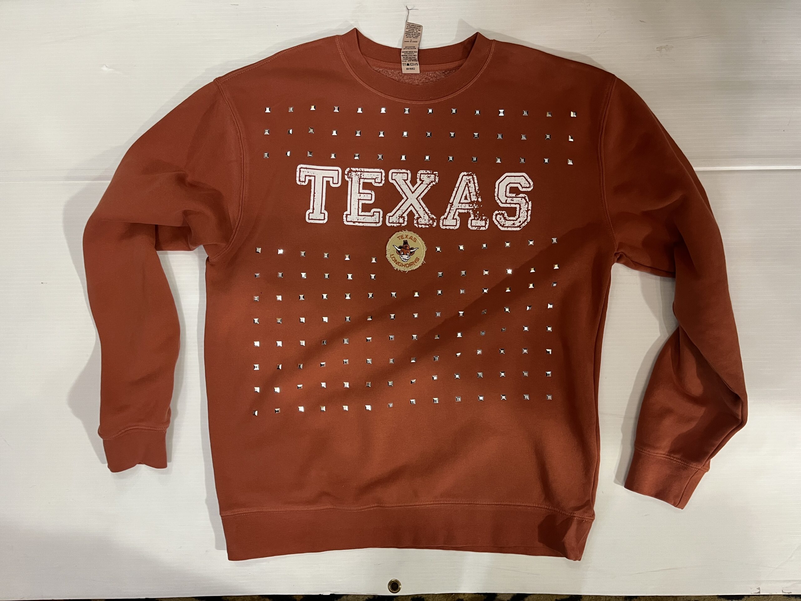 Soft fleece crewneck sweatshirt (unisex sizing) with prism studs, printing, and school logo patch.