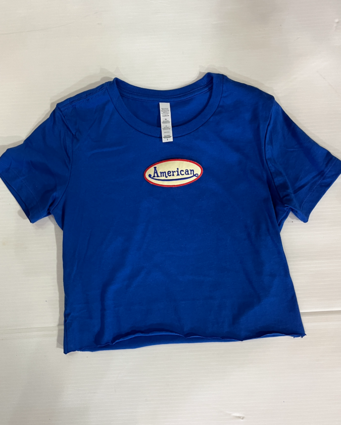 15 inch cropped 1X1 ribbed brami top with American University logo. 92% Nylon 8% Spandex