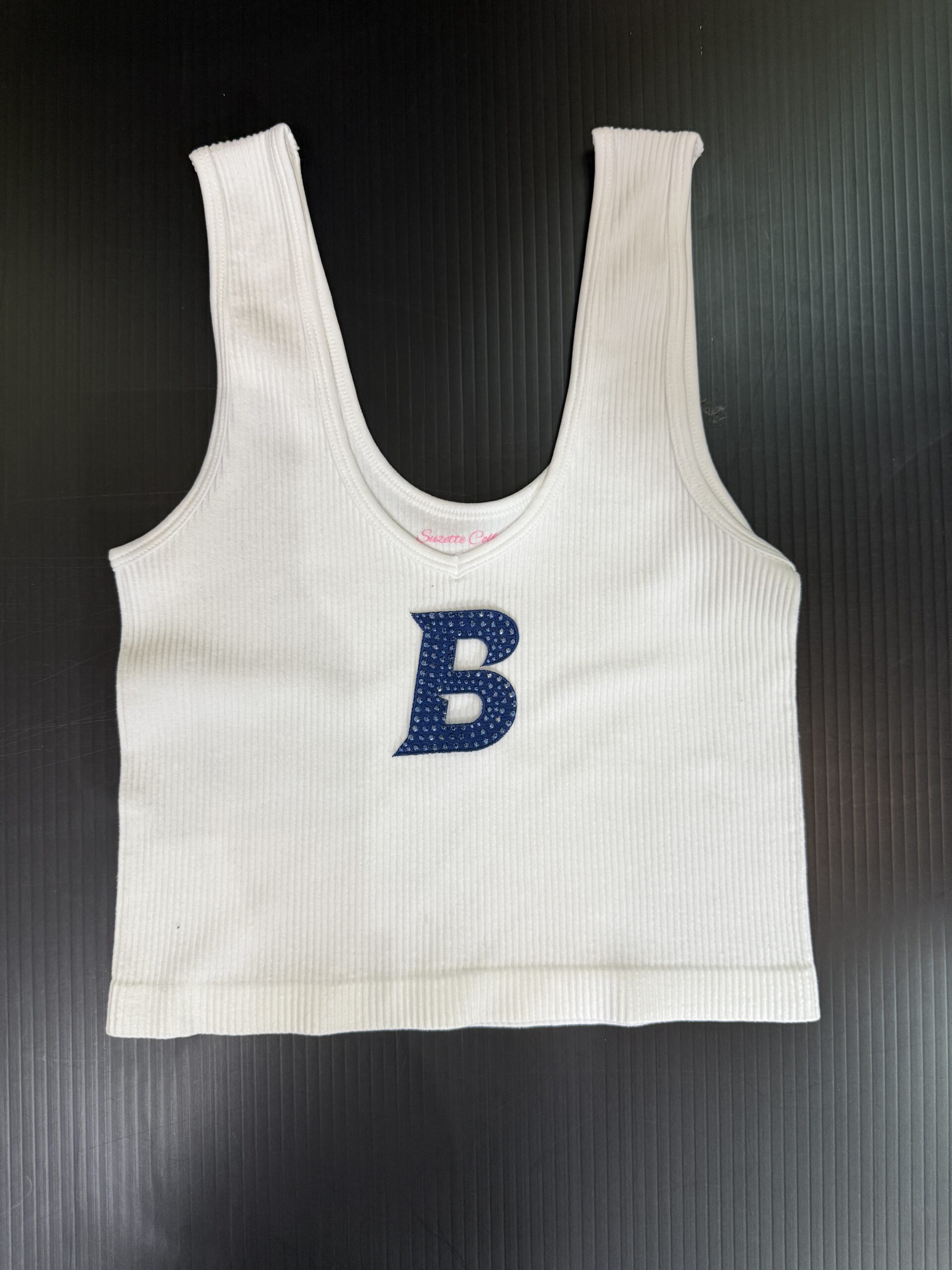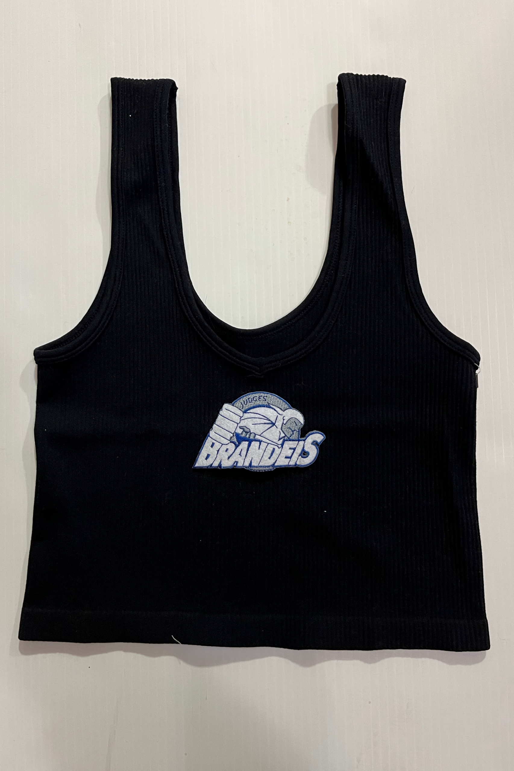 15 inch cropped 1X1 ribbed brami top with the Brandeis logo. 92% Nylon 8% Spandex