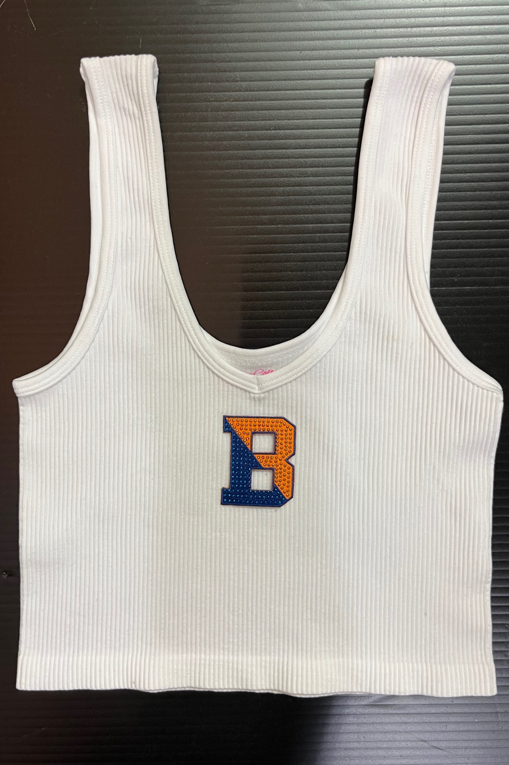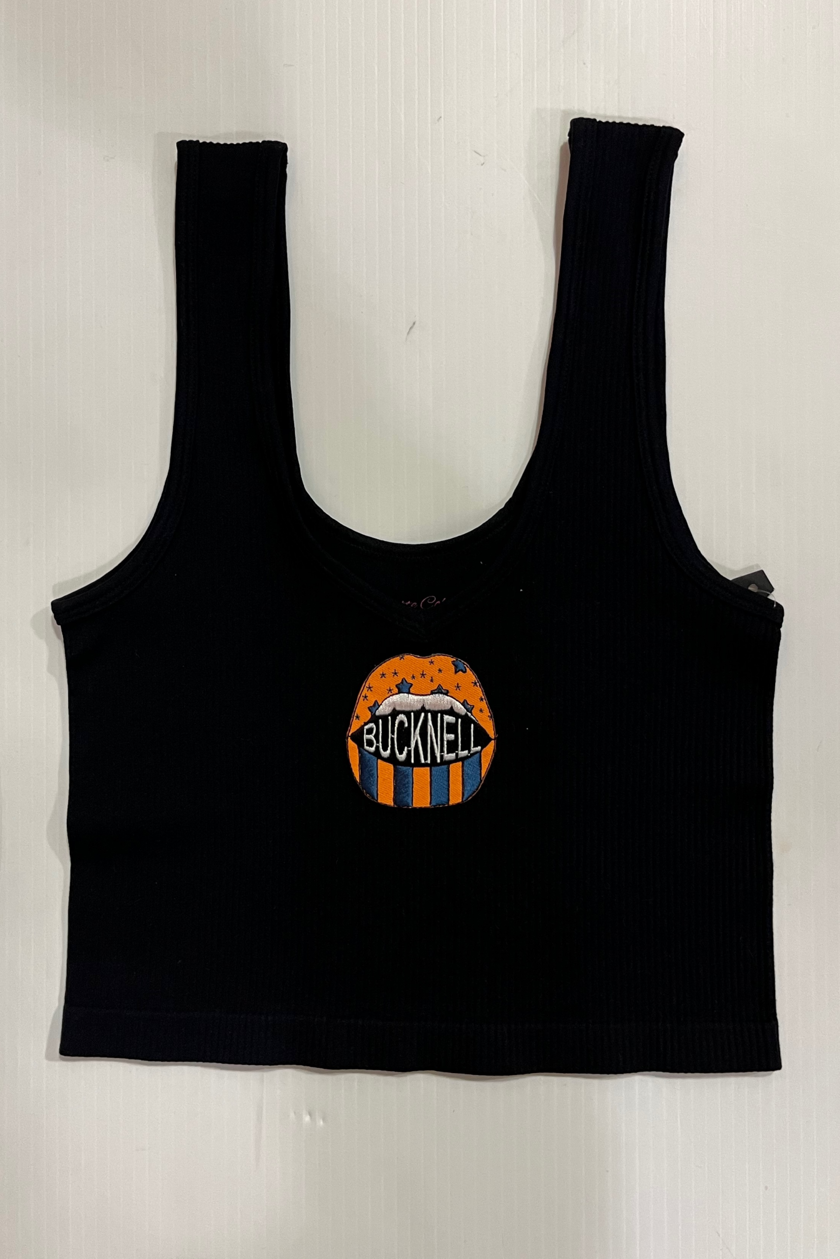 15 inch cropped 1X1 ribbed brami top with Bucknell logo. 92% Nylon 8% Spandex